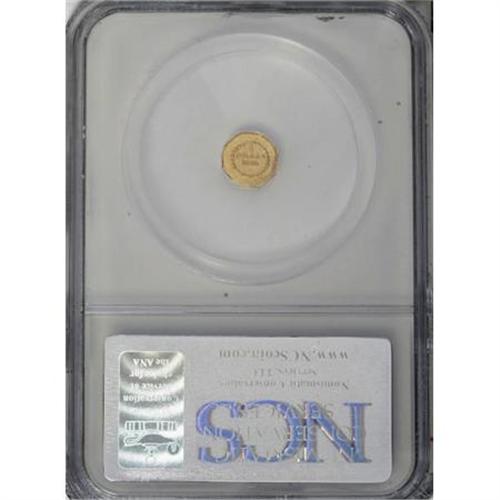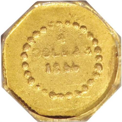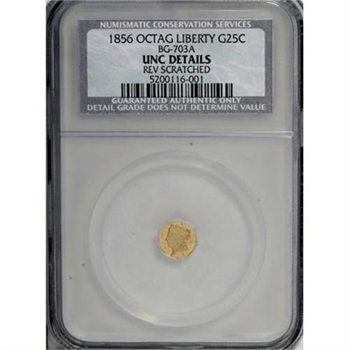 <B>1856 Liberty Octagonal 25 Cents, BG-703A, R.8--Reverse Scratched--NCS. Unc Details.</B></I> This extremely rare variety was first reported in the August 8, 1984 issue of Coin World. Only two survivors are listed in the second edition of Breen-Gillio, the discovery piece and the Roe plate coin. The present piece is neither of those. It is free from wear, but is subdued by a cleaning and has a thick cluster of vertical pinscratches near 3 o'clock. Nonetheless, an important opportunity for the dedicated collector of California small denomination gold.<BR><BR><b>Shipping:</b> Coins & Currency (<a target="_blank" href="http://www.heritageauctions.com/common/shipping.php">view shipping information</a>)