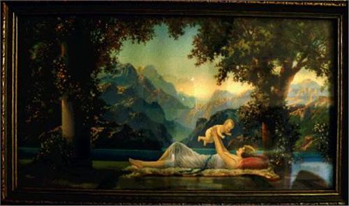 R.A. Fox. Another print by Fox, of girl holding a baby, entitled "Love's Paradise." 10 x 17 -1/2 . In contemporary frame, under glass.