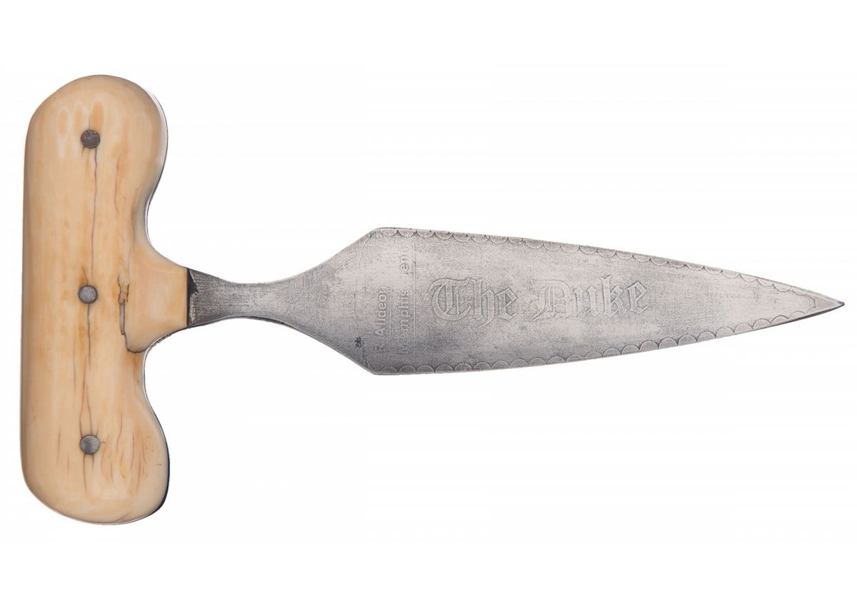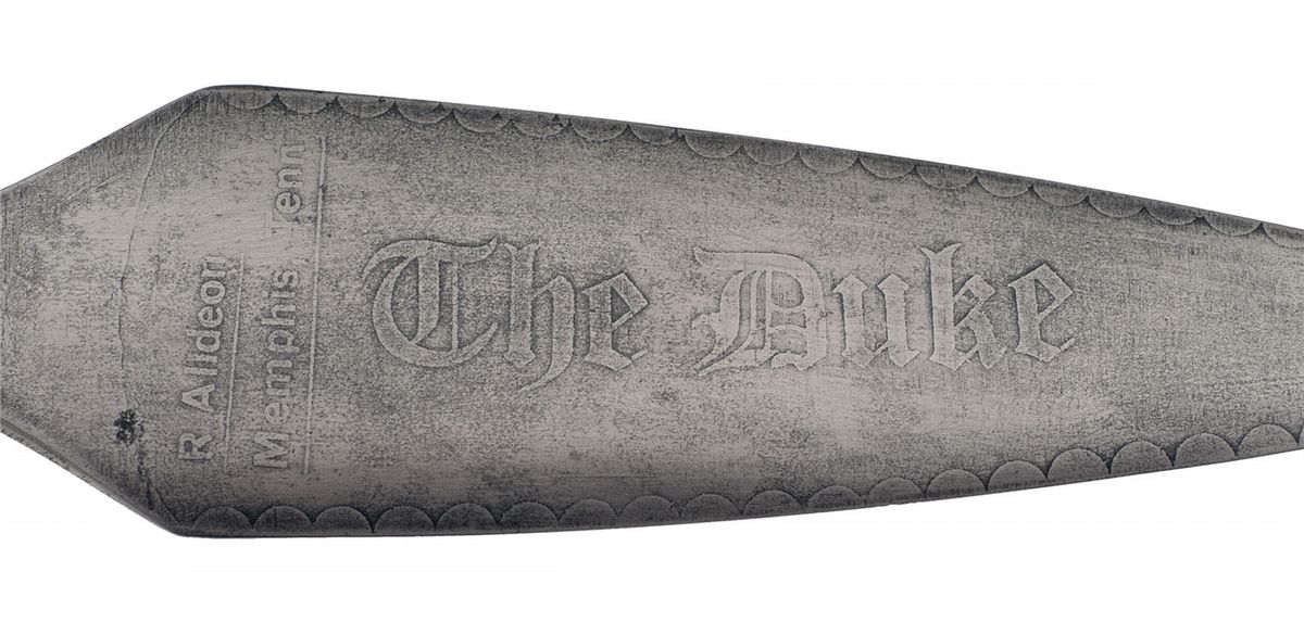 Measuring 7 inches in overall length, this dagger is equipped with a 4 1/4 inch leaf shaped double edged blade, etched with a King of Diamonds and 2 pair next to "Four Aces" on the one side, and "R Alldeon/Memphis, Tenn/The Duke" on the reverse, with bosh sides showing a scalloped border along the edges. The T-shaped handle measures 3 3/4 inches long and 1 3/20 inch thick, with a full width steel core and smooth ivory panels, contoured along the front for the middle and ring fingers. With a brass rivet reinforced brown leather sheath. Records place an "R Alldeon" in Memphis, Tennessee circa 1860. Often associated with the riverboat gamblers of the 1800s, push daggers were very popular with anyone in need of a compact and potent defensive weapon.