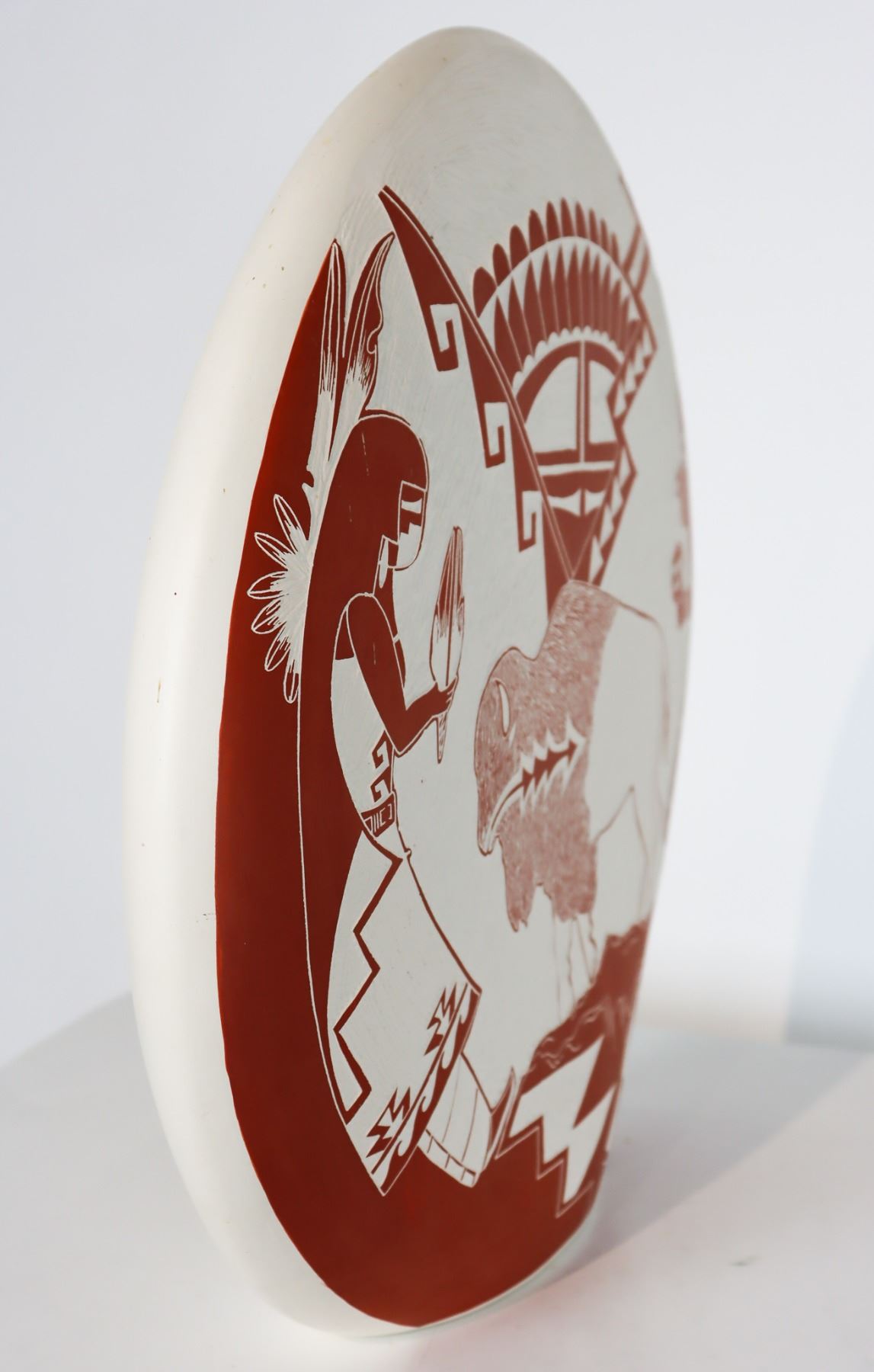 Native American pottery piece from Acoma Pueblo, red decoration on white clay, with detailed design, signed R. Aragon and dated 1987.