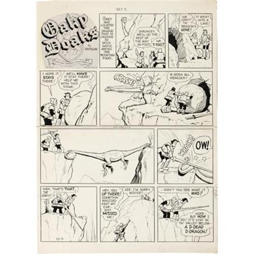 <B>R. B. Fuller - Okay Doaks Sunday Comic Strip Original Art (AP Features, undated). </B></I> Okay Doaks rids the merry mountain folks of a pesky dragon with a bit of derring-do. This thriller has an image area of 13.5" x 18'. The page has been cut horizontally along its center, and has since been rejoined with tape on the back; otherwise, the art is in Excellent condition. <BR><BR><b>Shipping:</b> Flat Material, Large (<a target="_blank" href="http://www.heritageauctions.com/common/shipping.php">view shipping information</a>)