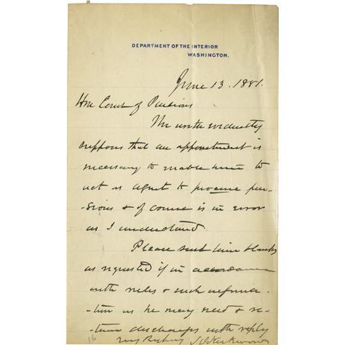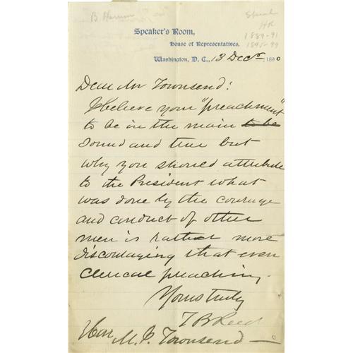 <B>Rutherford B. Hayes and Other Statesmen Autograph Collection</B></I> consisting of the following items: R. B. Hayes (Clipped Signature); Levi P. Morton, Benjamin Harrison's vice president (ALS); William E. Chandler, Secretary of the Navy under Arthur (ALS); Samuel J. Kirkwood, Secretary of the Interior under Garfield and Arthur (ALS); Thomas B. Reed, Speaker of the House (ALS); Hilary A. Herbert, Secretary of the Navy under Cleveland (ANS); Charles J. Folger, Secretary of the Treasury under Arthur (Signature); Hoke Smith, Secretary of the Interior under Cleveland (TLS). Items are in generally very good condition. From the Henry E. Luhrs Collection. Accompanied by LOA from PSA/DNA.