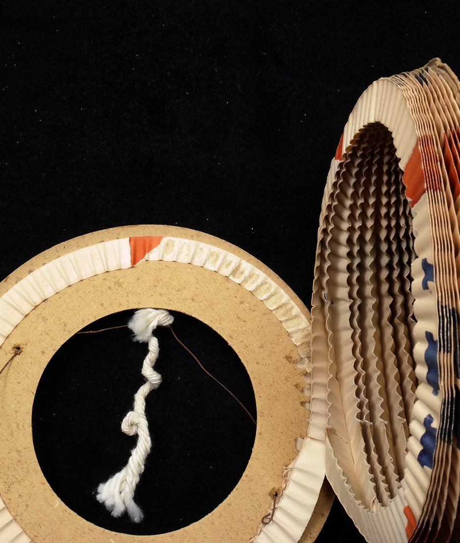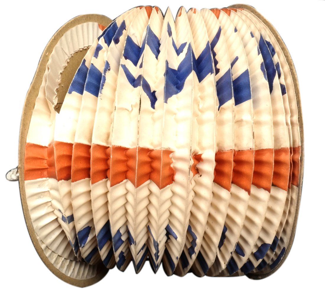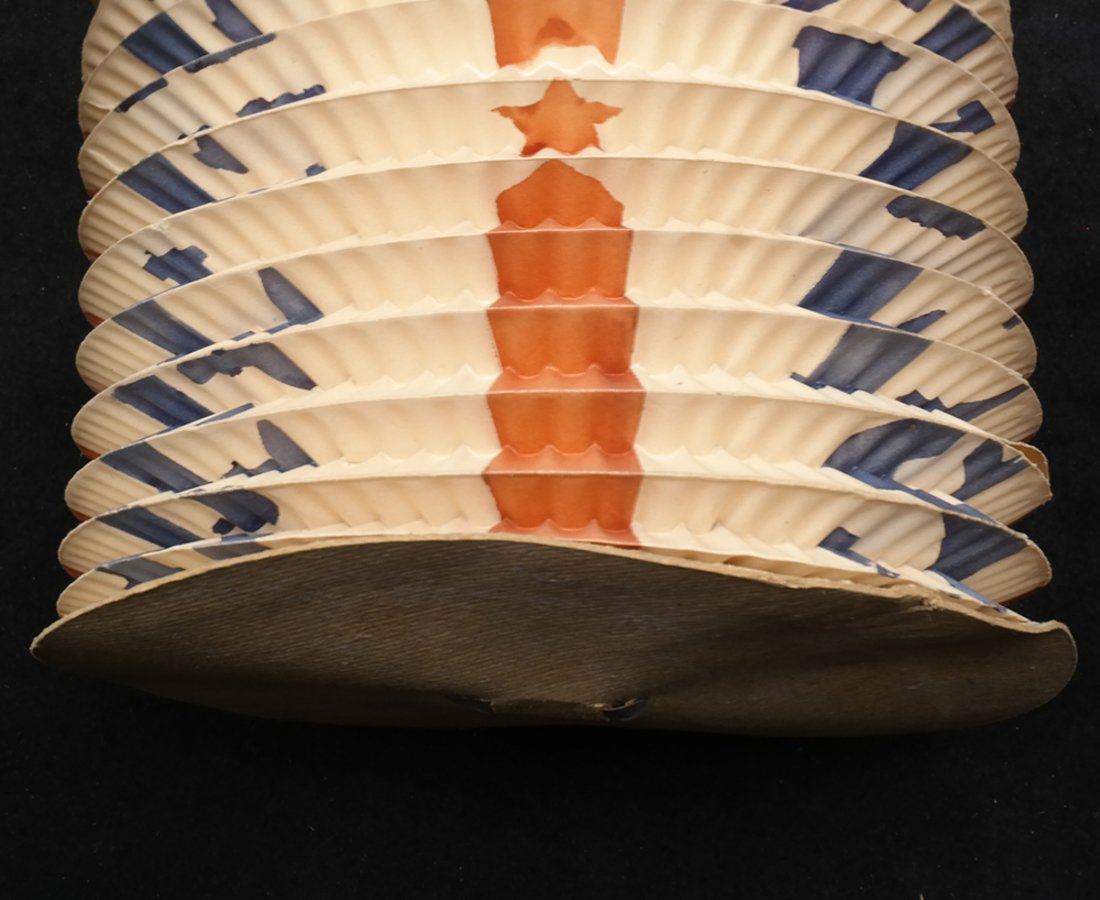 Cylindrical accordion-style paper lantern with cardstock ring at top and cardstock disc at bottom bearing candle-holder. Suspended on likely-original wire. Sides hand-stenciled in red and blue, "Hayes and Wheeler".