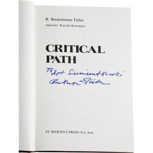 <B>R. Buckminster Fuller Inscribed:<I> Critical Path.</B></I></B></I> (New York: St. Martin's Press, 1981), first edition, 471 pages, inscribed by the author on the title page, maroon cloth with gilt titles, 8vo (6.5 x 9.5), light spotting to boards, else fine in a fine unclipped jacket. Includes a one page typed humorous narrative of the circumstances related to the occasion of this book's signing laid in.<BR><BR><b>Shipping:</b> Books & Catalogs (<a target="_blank" href="http://www.heritageauctions.com/common/shipping.php">view shipping information</a>)