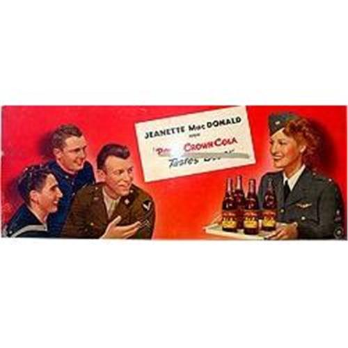 R.C.COLA SIGN, JEANETTE Mac DONALD WWII, cardboard, 11? x 28?, Jeanette serving drinks to military men, some damage