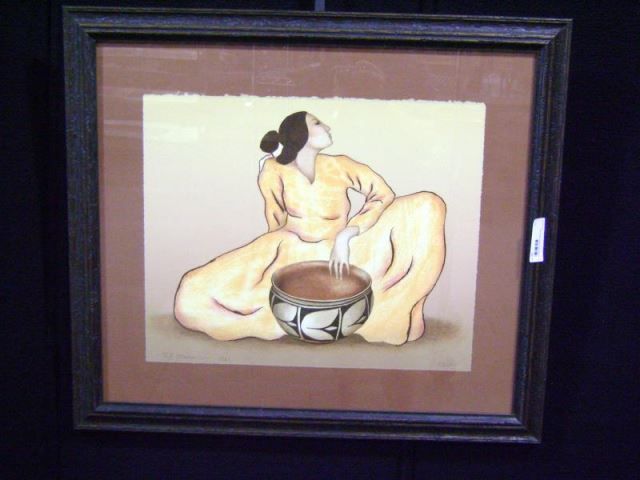 R.C. Gorman 1981 Lithograph of a Woman Seated in a Pale Yellow Dress w/ a Santo Domingo Pot Ed. 60/1