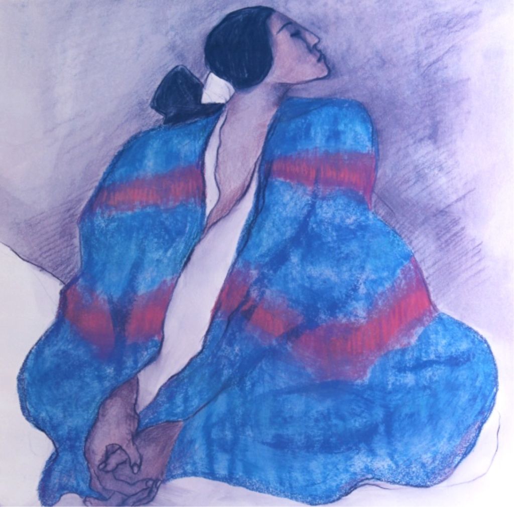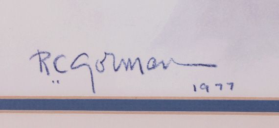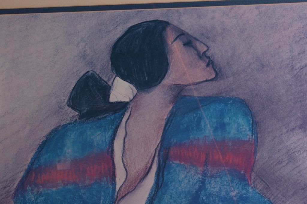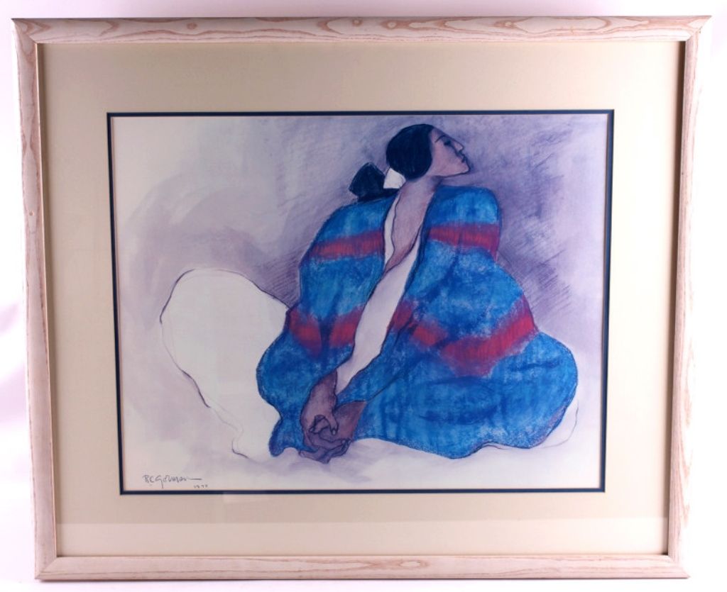 This is a framed R.C. Gorman print. Gorman's works are mainly influenced by the Southwest and Native Americans. This print is in very good condition. It has been professionally matted and framed. The frame measures 32.5" x 38.25".