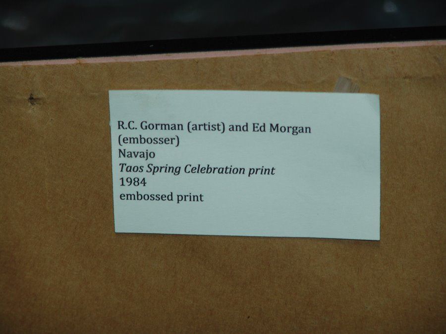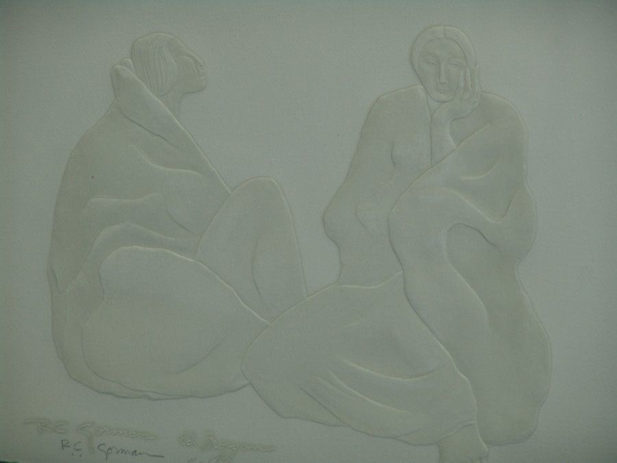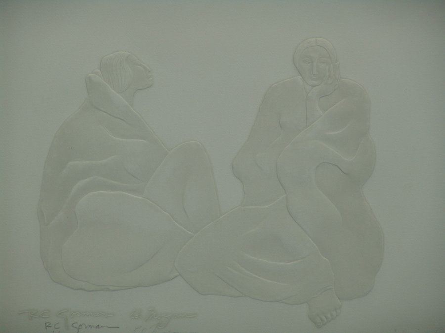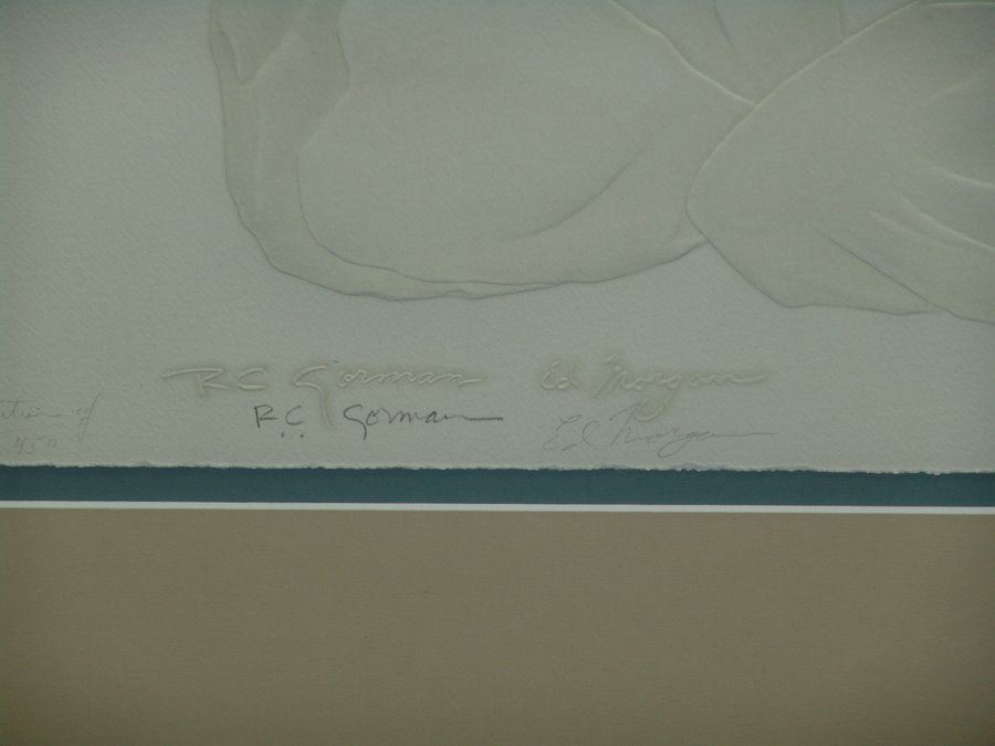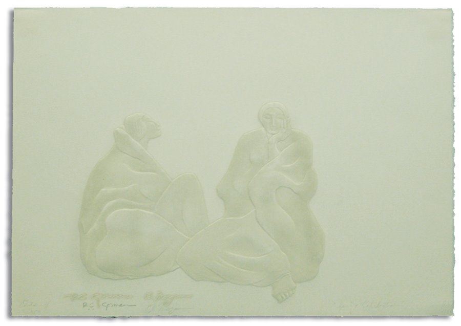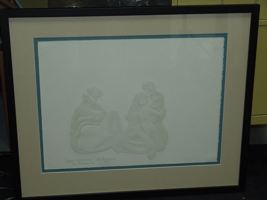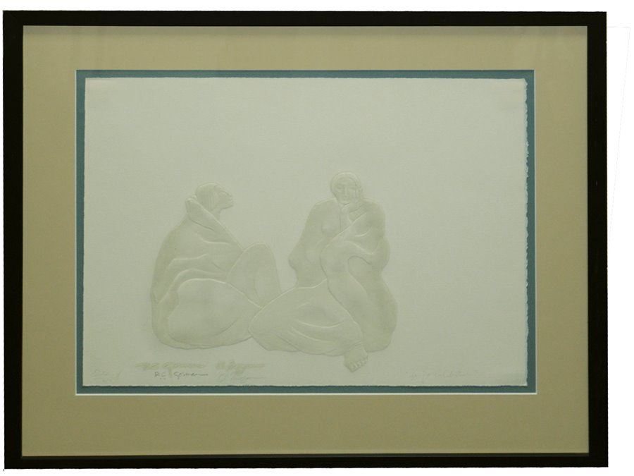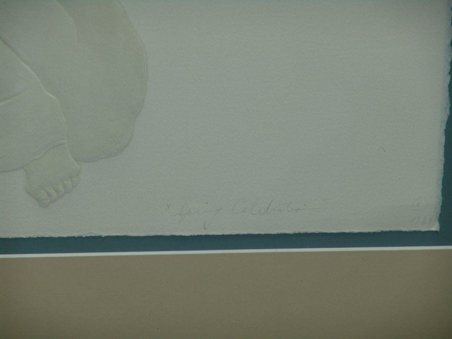 Large signed limited edition (# of 450) embossed work on rag cast paper showing two seated women and titled "Spring Celebrating" with embossing by Ed Mougan. Very good condition, custom matted and framed.,Ca. 1984,16" x 21" (23" x 27")