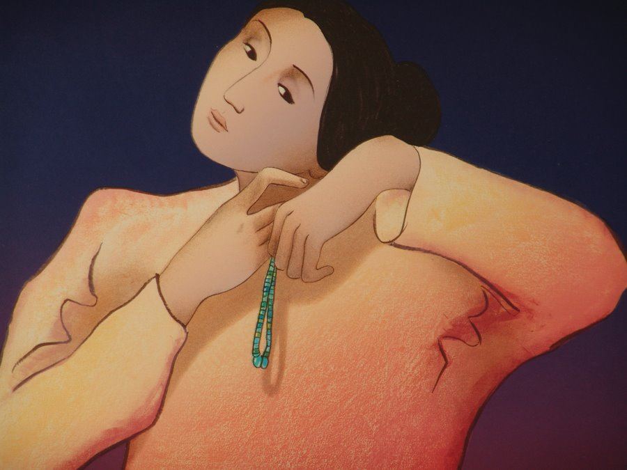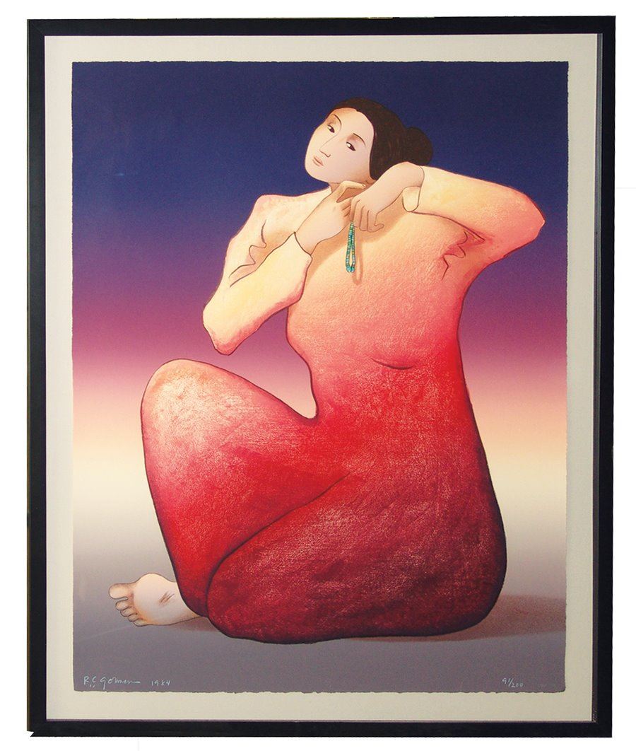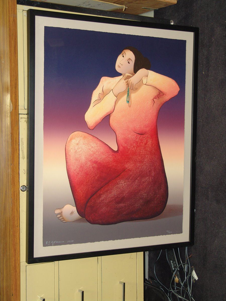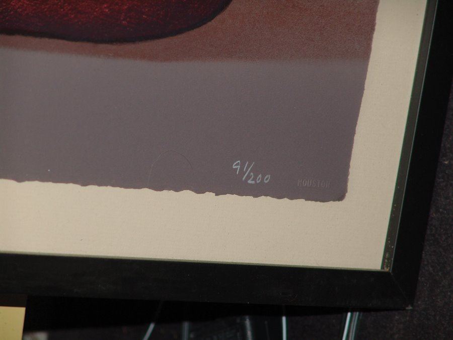 Large, colorful, signed limited edition (#91/200) lithograph on torn paper titled "Earring (Frances)." Excellent condition. In shadowbox frame.,,30" x 23" (35" x 27")