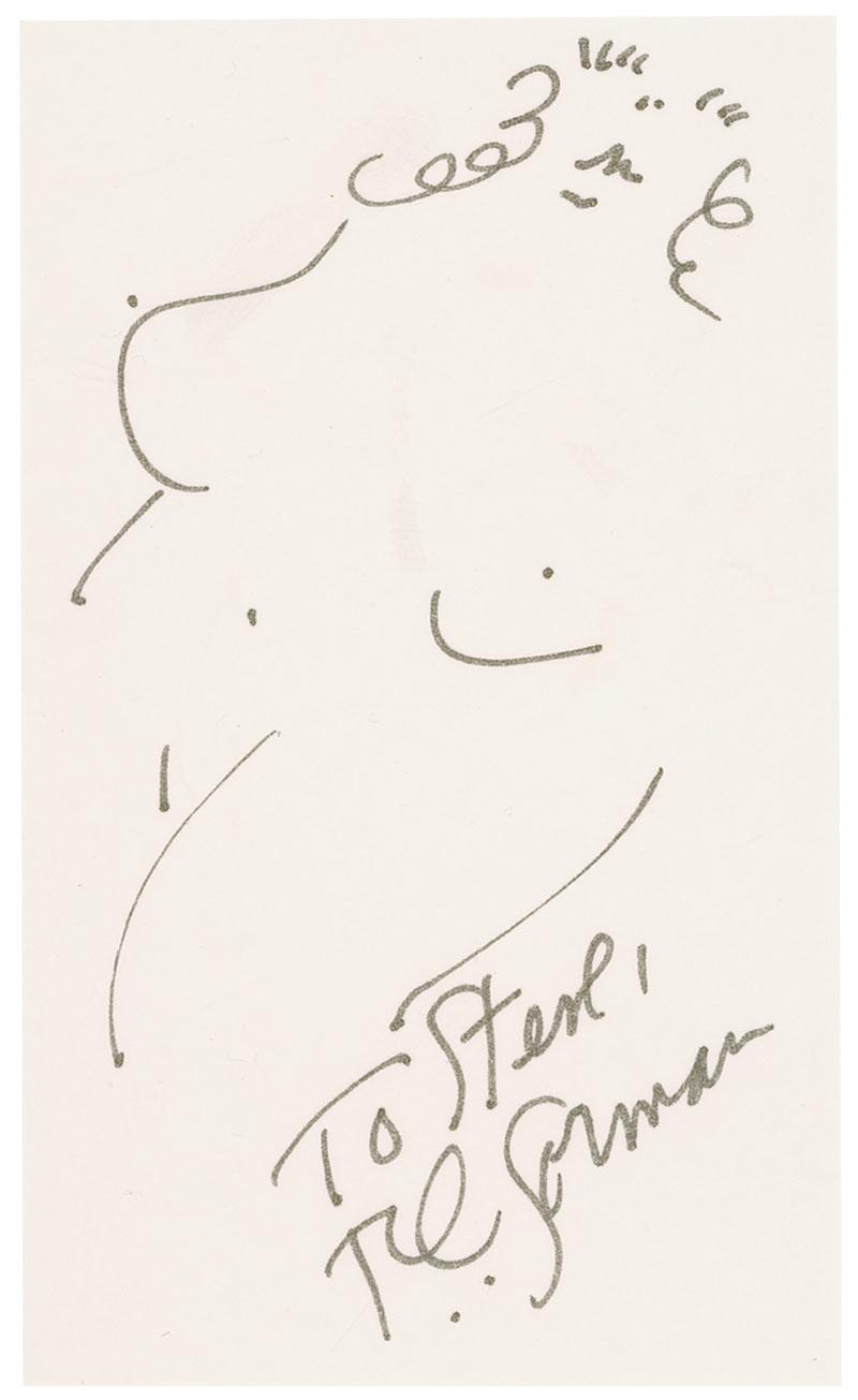 Navajo artist (1931–2005) sometimes referred to as ‘the Picasso of American Indian art.’ Original signed felt tip sketch of topless woman on an off-white 3 x 5 card signed and inscribed “To Steve, R. C. Gorman.” In fine condition. Accompanied by a clipped return address.
