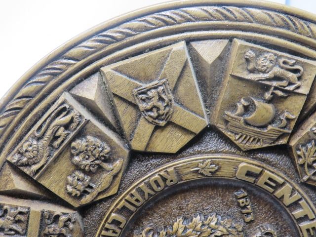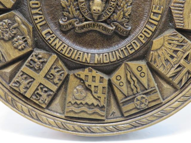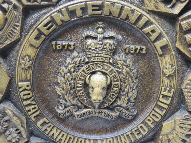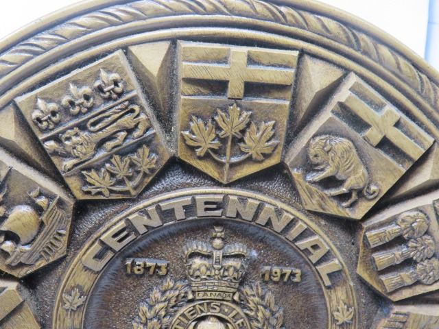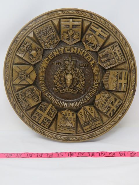 R.C.M.P. COMMEMORATIVE PLAQUE (WOOD) *1873-1973* (PROVINCIAL FLAGS) *13.25" DIAMETER X 1.5" DEEP*