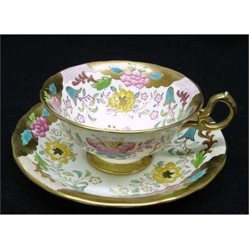 VICTORIAN HOUSE OF ANTIQUES,Presents:Rare in beauty,size and shape, English bone china tea cup and saucer,Fully HAND PAINTED DEPICTING FABULOUS gold gilt and floral decorations,Excellent - mint condition, this set is rare for it's beauty,size, shape and wide open tea cup with pedestal, as per our images - US Buyer to pay 7.00 for shipping plus insurance,THANK YOU.