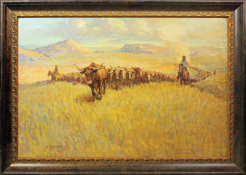 An attractive oil on board that is done in the style of Frederick Remington. A great cattle drive scene with nice color, by a listed artist, signed at bottom, and professionally framed with image measuring 24" x 36".