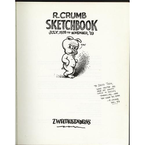 <B>R. Crumb Sketch Book July 1978 to Nov. 1983 (Zweitausendeins, 1984) Condition: VF/NM.</B></I> Underground Comix legend Robert Crumb never traveled anywhere without his Rapidograph technical fountain pen and a sketchbook. Any spare moment of the day or night would find him busy in his book, doodling wild sketches, comics, observations, curses, and more with the obsession of a man truly possessed. And obsessed he was - with sex, fame, old records... everything. The incredible drawings found in his many sketchbooks found their way to a series of beautifully produced hardbound volumes by a German printer, and this book is from that series. They were hard enough to find when published; now that they are all out-of-print, they rarely turn up. Making this copy even more special is the fact that it was originally a gift from Crumb himself, to this very Heritage comics describer. Crumb left an inscription on the title page, in his usual Rapidograph hand-lettered script, that reads: "To David Tosh, who helped me save my sanity while in Dallas, thanks, pal... hope you enjoy the book", and is signed and dated "Dec. '84". Now you can enjoy the book, too - for the right bid! Note: this copy has the original cardboard slipcase, but not the German translation pamphlet, which Crumb must have kept or thrown out. Fogel's Underground Price Guide NM 9.4 value = $150. <BR><BR><B>Important notice:</B> Heritage usually auctions material at the rate of 200-250 lots per hour. On some occasions eBay Live bid software or the Internet may not be able to keep up with the pace of the auction. We recommend placing a realistic absentee bid now as insurance to avoid disappointment. Occasionally the auctioneer may eliminate or reject an eBay Live bid, and the auctioneer may also reopen a lot after the close of the eBay live bidding (usually because we missed an audience bid), and may reject your bid even if it shows you as the winning bidder. By bidding via eBay Live, you agree that Heritage may award the lot to another bidder at its sole discretion under the circumstances described above or any other reasonable circumstances. Since eBay bids are not shown to us until we open the lot on the floor, we treat those bids just like floor bids. In most cases the floor responds before the eBay bid is presented to us, due to Internet lag time, so for consistency we have made it a policy that floor bids are always considered first over tie eBay live bids. Also please note that all Heritage lots purchased through eBay Live carry a 22.5% Buyer's Premium. Please make sure you read the Terms and Conditions before you bid. This lot is being auctioned in conjunction with a live floor auction by Heritage Auction Galleries. All final auction and invoice information will be supplied by Heritage Auction Galleries, and all other information should be considered preliminary. Lot:41001 <BR><BR><B>Winning Notification and Billing:</B> After the FINAL session in this auction is complete, Heritage will send e-mail and snail mail invoices. This process normally takes several days. All final auction and invoice information will be supplied by Heritage Auction Galleries, and all other information should be considered preliminary. <BR><BR>This auction will be conducted on a live auction floor and over the Internet through eBay Live. If you choose to place an absentee bid, please take a moment to <font color='#0000ff'><u><a href='http://pages.ebay.com/liveauctions/help/before/laabsentee.html'>learn how eBay Live absentee bidding works</a></u></font><font color='#000000'>