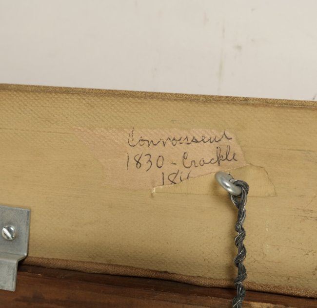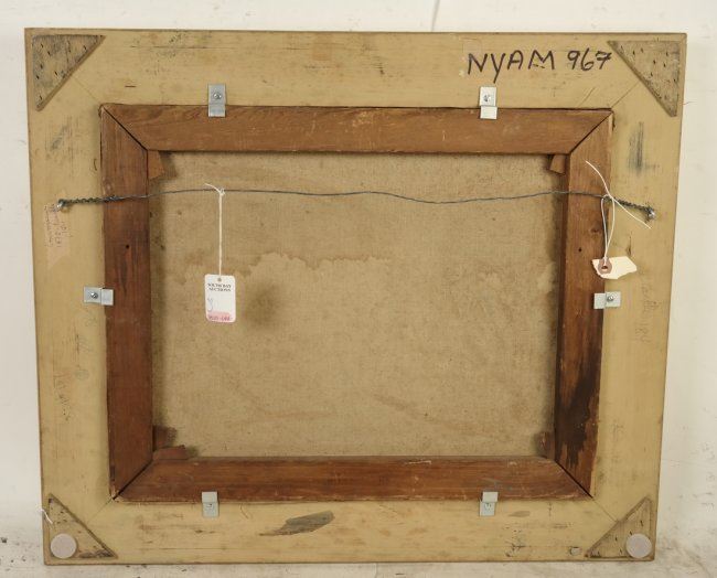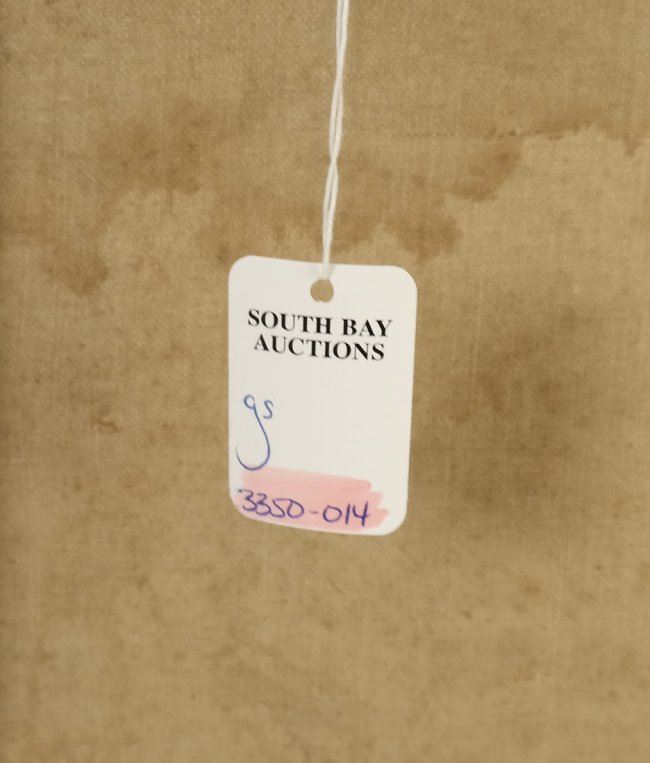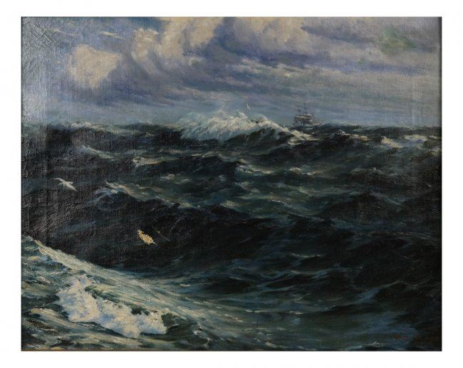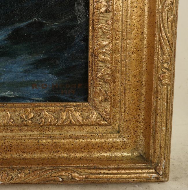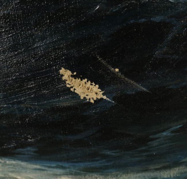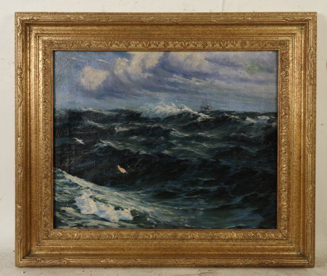 Framed oil on canvas of a seascape. Signed lower right and dated "1919". Large scrape approximately 1", some in painting, craquelure.