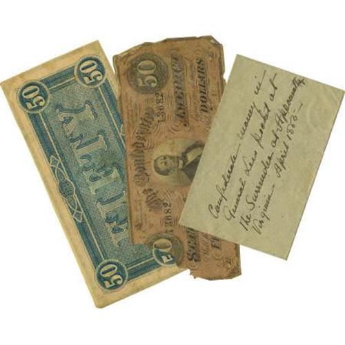 <B>ROBERT E. LEE’S CONFEDERATE MONEY GIVEN PROVENANCE BY FITZHUGH LEE.</B></I> Two Confederate $50 bills are accompanied by a gray envelope, 5.25” x 3.5”, the face of which is boldly inscribed in Fitzhugh Lee’s hand as follows: “<I>Confederate money in General Lee’s pocket at the Surrender at Appomattox Virginia - April 1865.</B></I>” The envelope and one note are in fine condition, while the second note is in poor condition with heavy soiling and substantial areas of loss. Condition, however, is moot considering just <I>what</B></I> these notes <I>are</B></I> and where they have <I>been</B></I>. Here is a rare opportunity to acquire a personal memento of General Lee that any museum would gladly display. <BR><BR><b>Shipping:</b> Flat Material, Small (<a target="_blank" href="http://www.heritageauctions.com/common/shipping.php">view shipping information</a>)