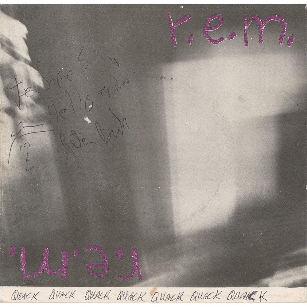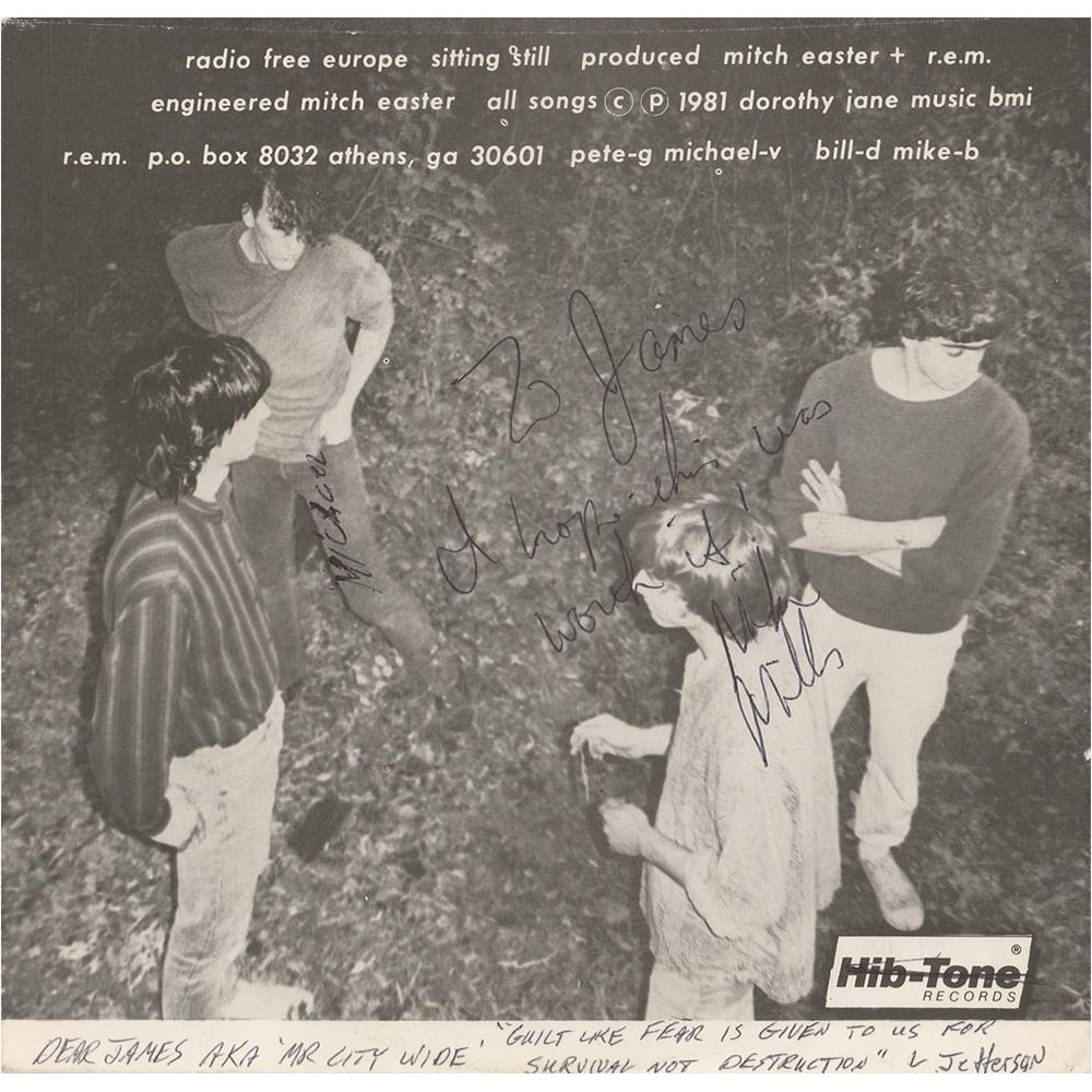 Hib-Tone Records 45 RPM record for the R.E.M. single ‘Radio Free Europe / Sitting Still,’ signed and inscribed on the back cover in black ballpoint, “To James, I hope this was worth it! Mike Mills” and “Michael,” and on the front cover, “To James, Hello again, Pete Buck,” who adds a smiley face sketch, with an unknown hand adding a series of ‘Quacks’ along the bottom. The back cover is ostensibly also signed by the band’s manager Jefferson Holt, who writes: “Dear James AKA ‘ Mr. City Wide,’ Guilt like fear is given to us for survival not destruction,’ L Jefferson.” In very good condition, with overall creasing. The record is included. A very desirable set of early R.E.M. signatures on the band's debut single, which received critical acclaim and led to a record deal with I.R.S. Records.