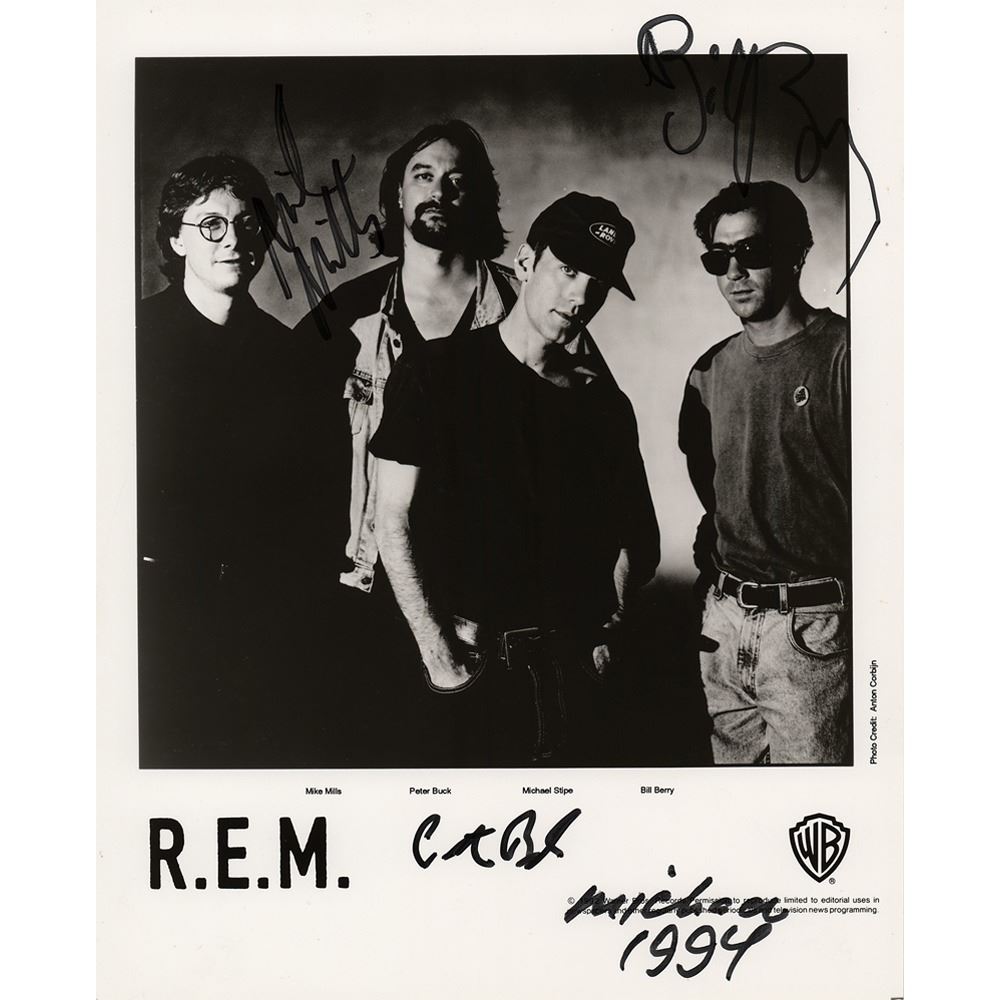 Satin-finish 8 x 10 Warner Bros. Records publicity photo, signed in black felt tip by Michael Stipe, who adds "1994," Mike Mills, Bill Berry, and Peter Buck. In very good to fine condition, with scattered light surface creases.