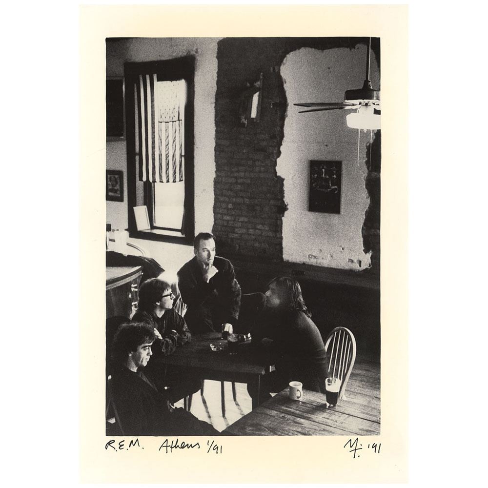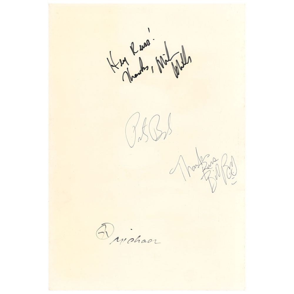 Promotional folder for R.E.M. dating to their Out of Time album, 10 x 14.5 (30 x 14.5 open), signed and inscribed inside to a Warner Bros. executive in black felt tip, “Michael [Stipe],†who adds a peace sign, and “Hey Russ! Thanks, Mike Mills,†and in black ballpoint, “Peter Buck†and “Thanks, Russ, Bill Berry.†In fine condition.