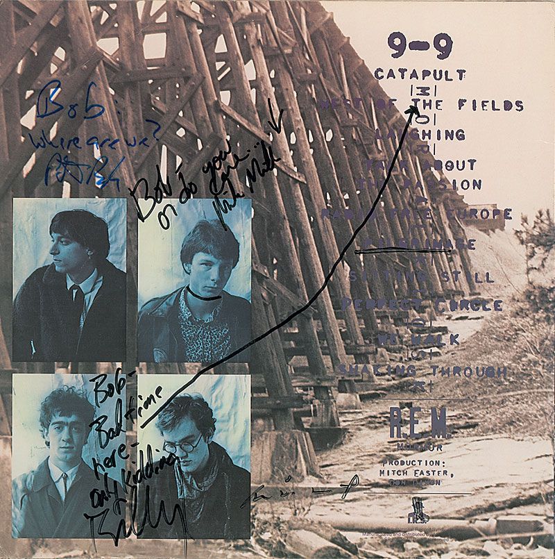 Murmur album signed and inscribed on the back cover in black felt tip, “Bob: Where are we? Peter Buck,” “Bob—or do you care? Mike Mills,” “Bob—Bad time here—only kidding, Billy [Berry],” and “Michael Stipe.” In fine condition. The record is included. Accompanied by a full letter of authenticity from Roger Epperson/REAL.