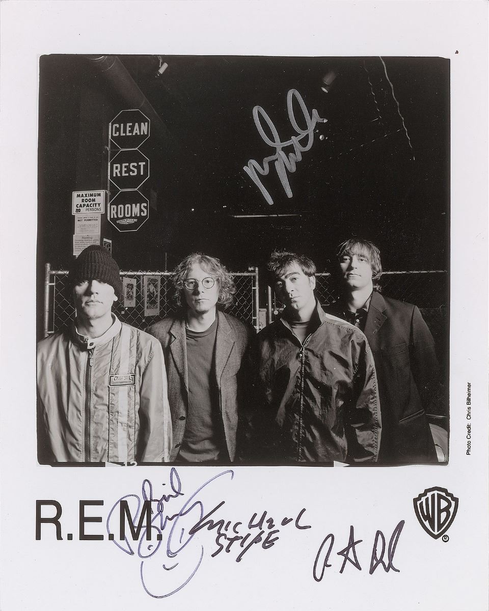 Satin-finish 8 x 10 Warner Brothers publicity photo of R.E.M., signed in silver ink, “Mike Mills,” and in black felt tip, “Michael Stype,” “Peter Buck,” and “Bill Berry,” adding a smiley face. In fine condition, with a light bend to the right side.