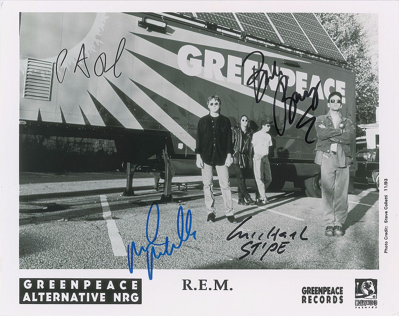 Glossy 10 x 8 Greenpeace Records publicity photo of R.E.M. circa 1993, signed in blue felt tip by Mike Mills, and in black felt tip by Bill Berry, Michael Stipe, and one other. In very fine condition.