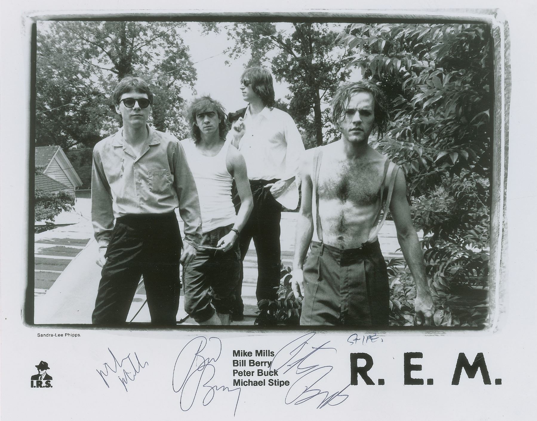 Glossy 10 x 8 I.R.S. Records promo photo of R.E.M., signed in the lower border in black ballpoint by Michael Stipe, Mike Mills, Bill Berry, and Peter Buck. In fine condition.