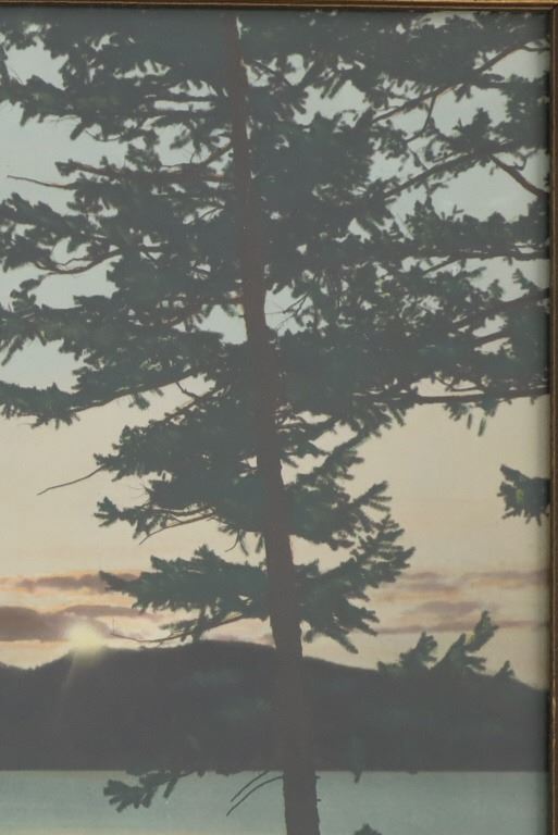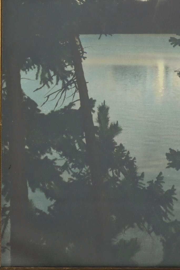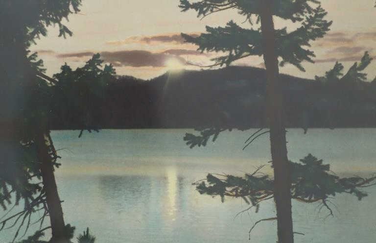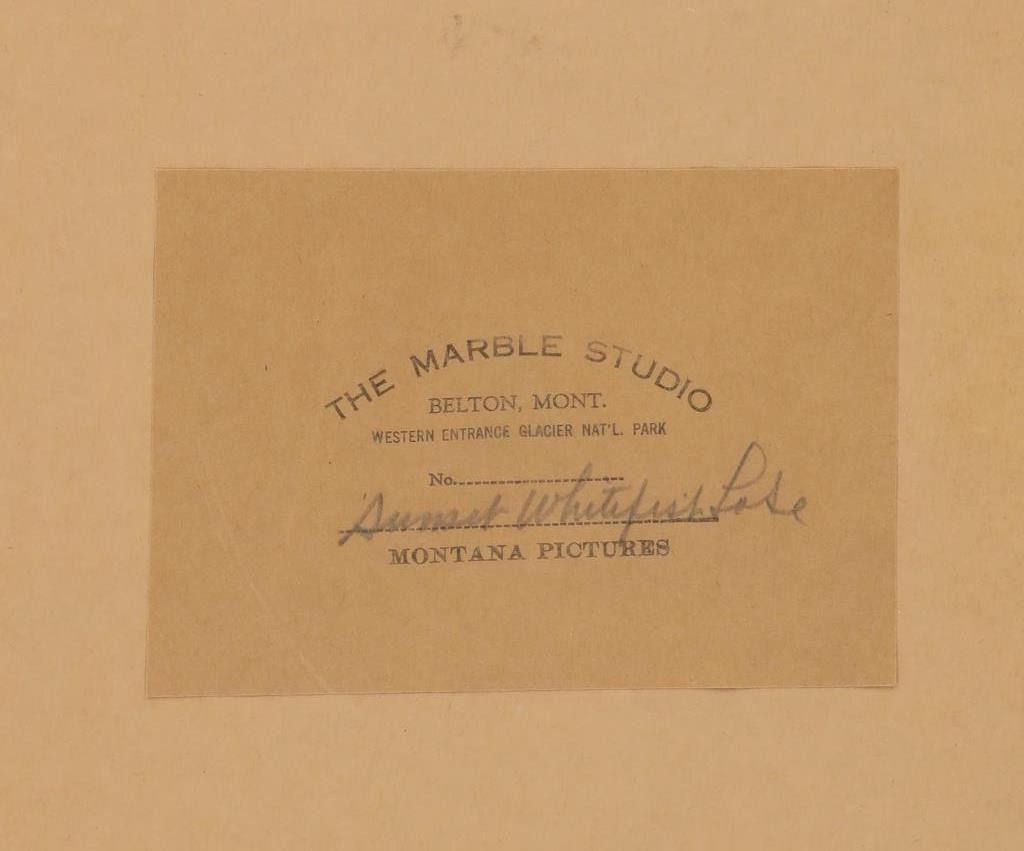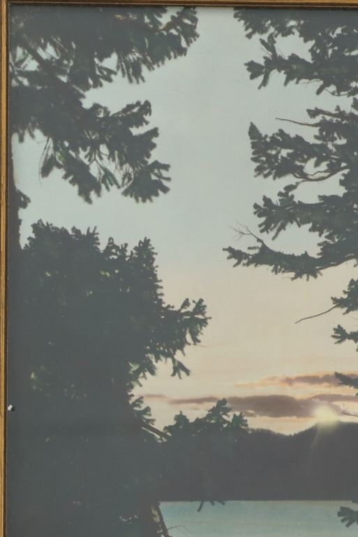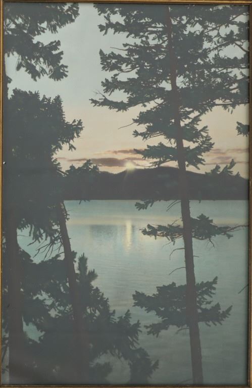 Featured in this lot is this framed photograph called "Sunset Whitefish Lake," from Montana photographer R.E. Marble born in 1883 and died in 1938. The photograph features a wonderfully and professionally crafted hand tinted photograph that shows a view of the lake with the sun setting over a far hill inside the tree line probably on a hill size. R.E. Marble (1883-1938). Ray Elmer Marble (Montana, 1883-1938) was an iconic Montana photographer who had a studio in Belton, Montana and Whitefish, Montana and was hired by the Great Northern Railway to take scenic pictures of Glacier National Park for its railroad brochures until 1924. Renowned for his striking photographs of Glacier National Park, photographer, Marble's works is highly sought by collectors. The condition of this framed photograph shows well preserved stature with some small wear marks to the frame but otherwise shows no obvious signs of damage to the photograph itself. The measurements of this framed photograph is 14 7/8" x 10 3/8" and the visible photograph measures 12 7/8" x 8 5/8".