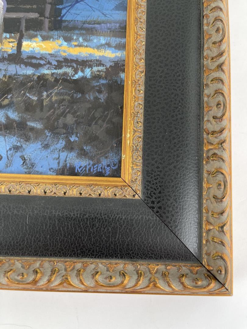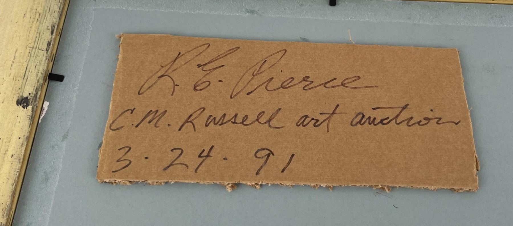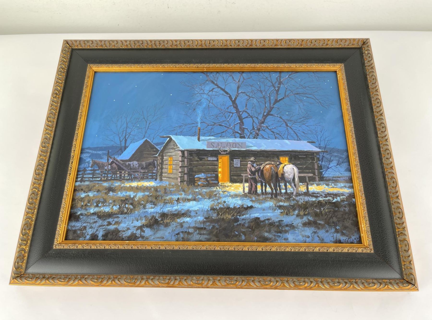 19 1/4" by 25" framed. Title is Frontier Saloon. Originally sold in the CM Russell Art Auction in 1991. Driven from childhood to excel in painting, R.E. Pierce has strived to create works of art that capture the feel and excitement of both the early and contemporary West that appeals to every collector. A diverse professional artist since 1973, Pierce has taught watercolor, and has participated in numerous Western Art Shows and exhibitions throughout the United States. He has shown at the prestigious C.M. Russell Auction in Great Falls, Montana, where Pierce is entering his 25th consecutive year as a participating artist. He was also involved in the C.M. Russell Museum's 1999 "The Cowboy, Today's Tradition" exhibition. His artwork has been featured on The Bradford Exchange Series of collector plates and Leanin' Tree cards. His work is in the Favell Museum's Permanent Art Collection, and the U.S.M.C Combat Art Collection. He was chosen as the Ellensburg Art Auction Poster Artist for 1996. Currently, Pierce is using his experience as a U.S. Marine in Viet Nam for a series of paintings, one of which was featured in "Viet Nam" magazine.