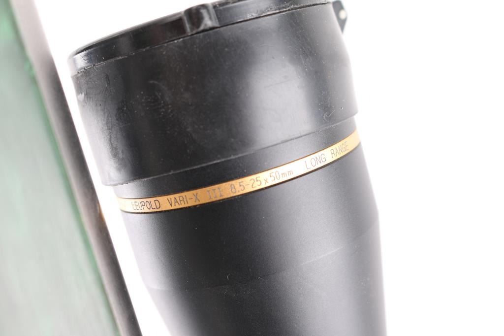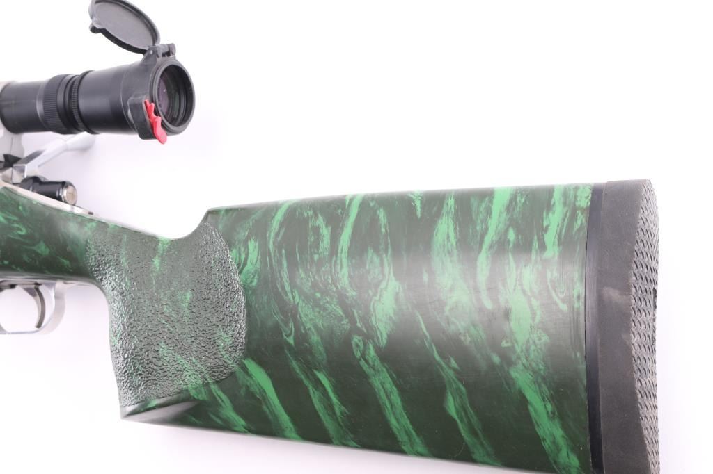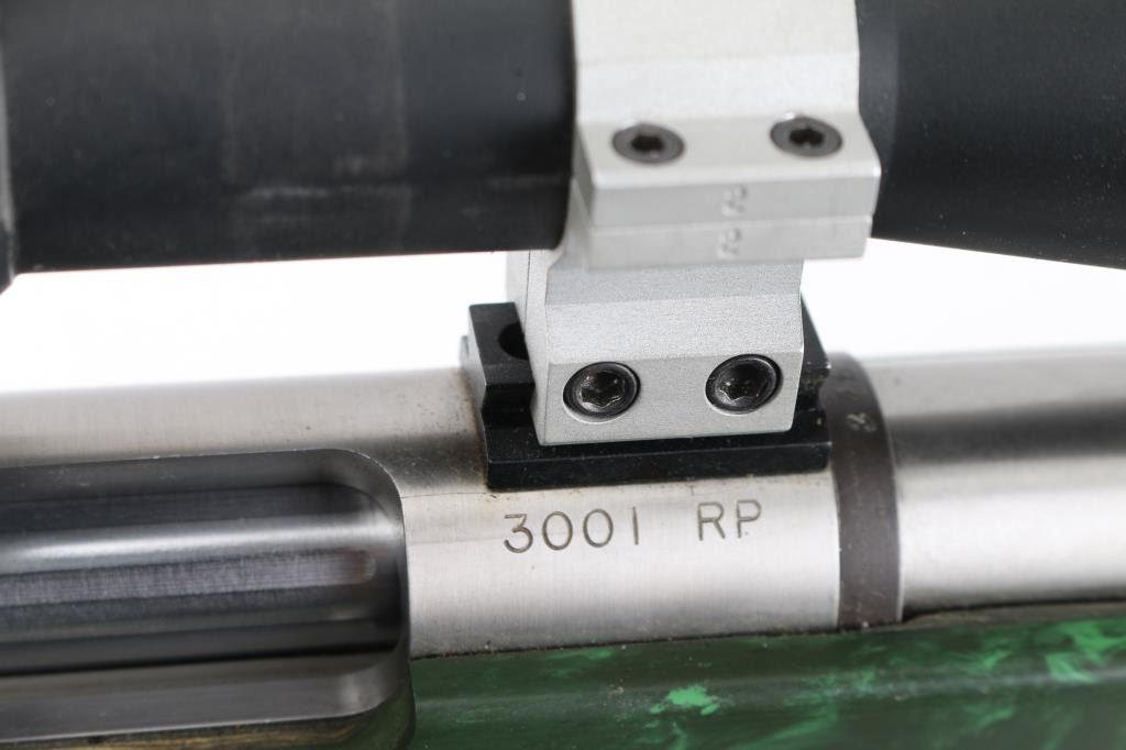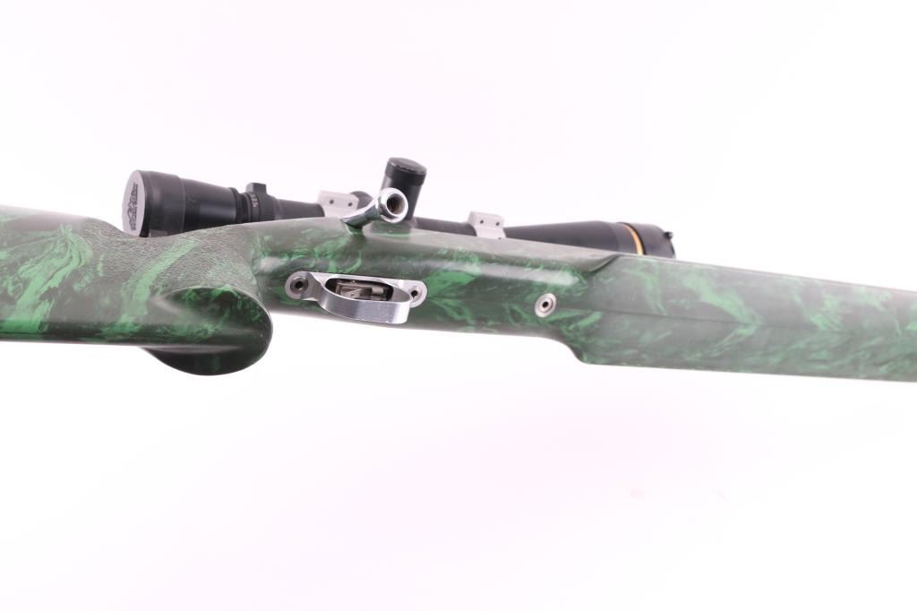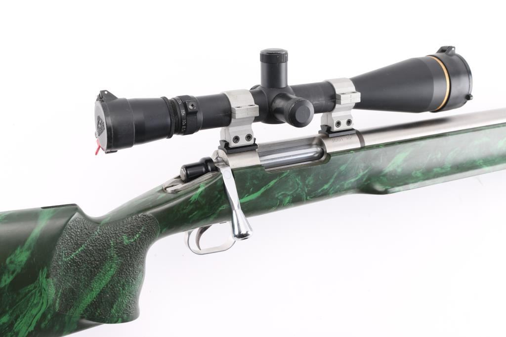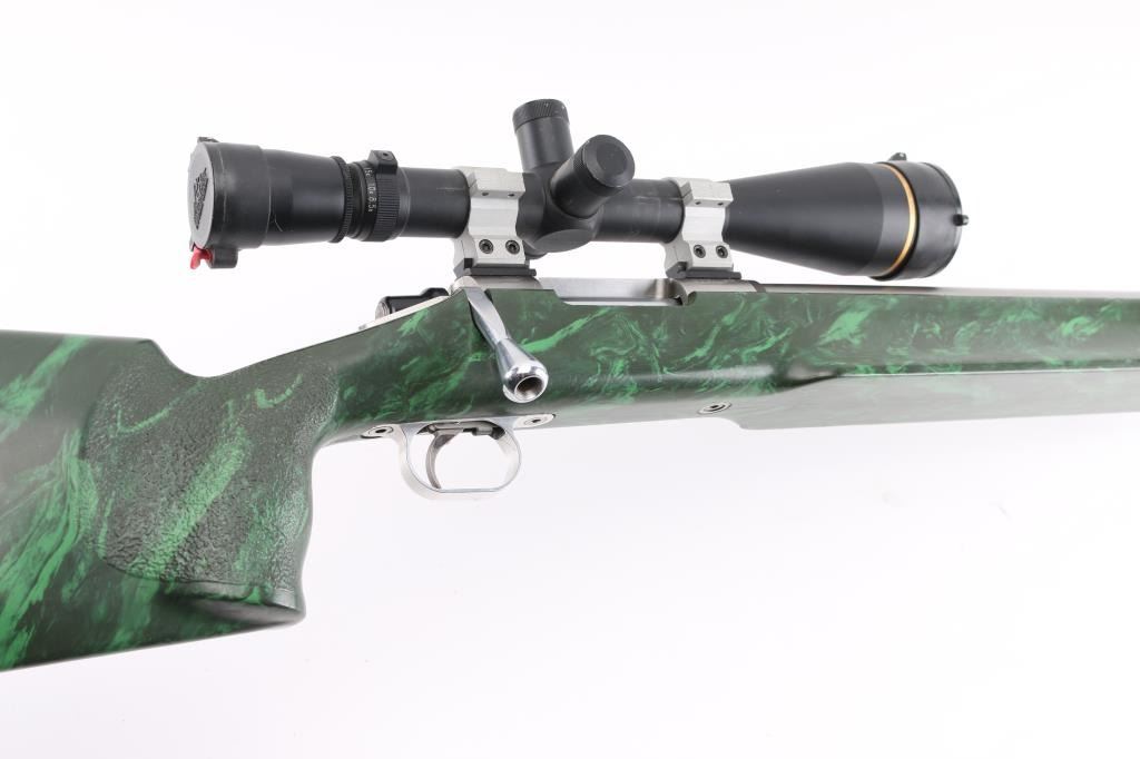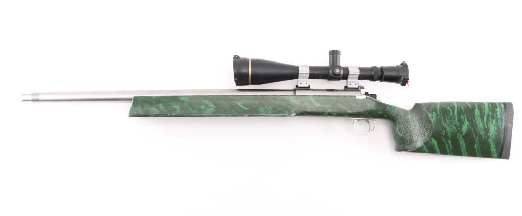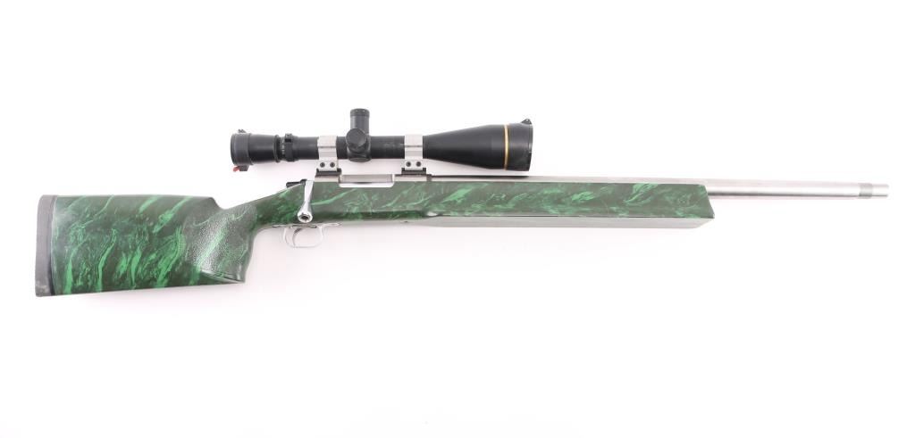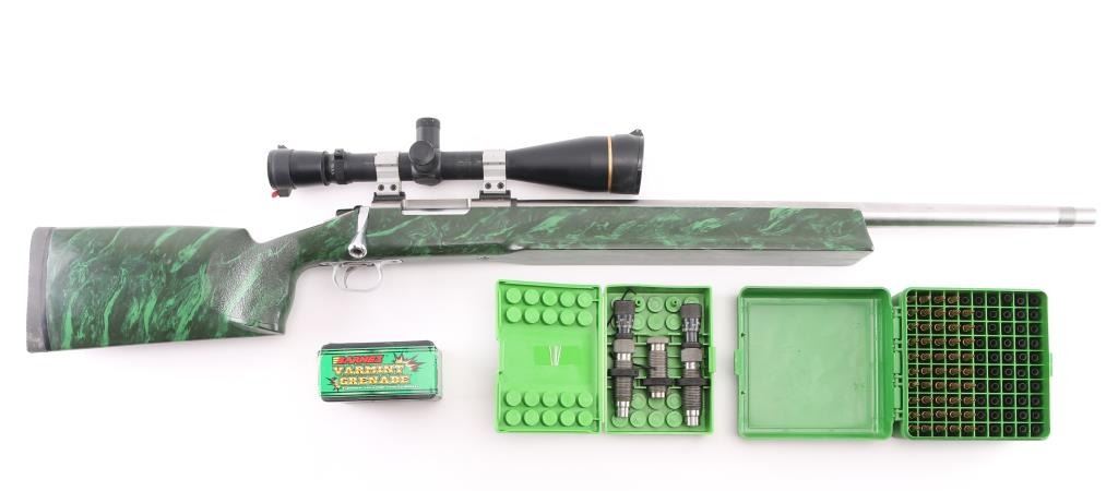 High quality custom single shot bolt action rifle based on the Remington 700 or XP-100 type actions. Features stainless steel construction, 25" heavy bull barrel with threads at muzzle, green colored composite flat bottom bench rest stock (appears to by by McMillan), dovetail block scope bases on receiver, Leupold Vari-X III 8.5-25x50mm side focus scope with fine crosshair & dot reticle. Barrel is bedded under chamber, free floated forward. Bore is excellent. Overall near new condition with handling marks and minor blemishes. Includes Redding reloading dies, large assortment of brass, bullets, loaded ammo. Condition is NRA Excellent *** Modern Firearm ***