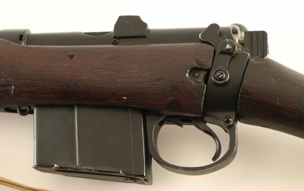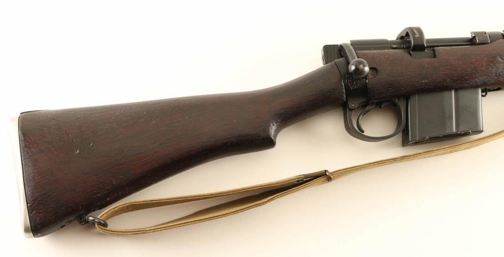 Rifle, Bolt-action. 1965 dated. Also known as the Ishapore. India Military issue. Made 1962-1974. Styled after the British Enfield. Matte black finish. 2-piece wood stock, and handguard. 25" barrel, with sliding ramp rear sights. Bore appears very good, but a little dark/dirty. 10-rd detachable magazine. Steel butt plate. Metal, and wood have small dings, and scratches as expected of a surplus military rifle, but overall very nice condition. No visible import marks. Attached is a 1941 dated British rubberized Enfield sling. NRA Condition-Very Good. Modern firearm