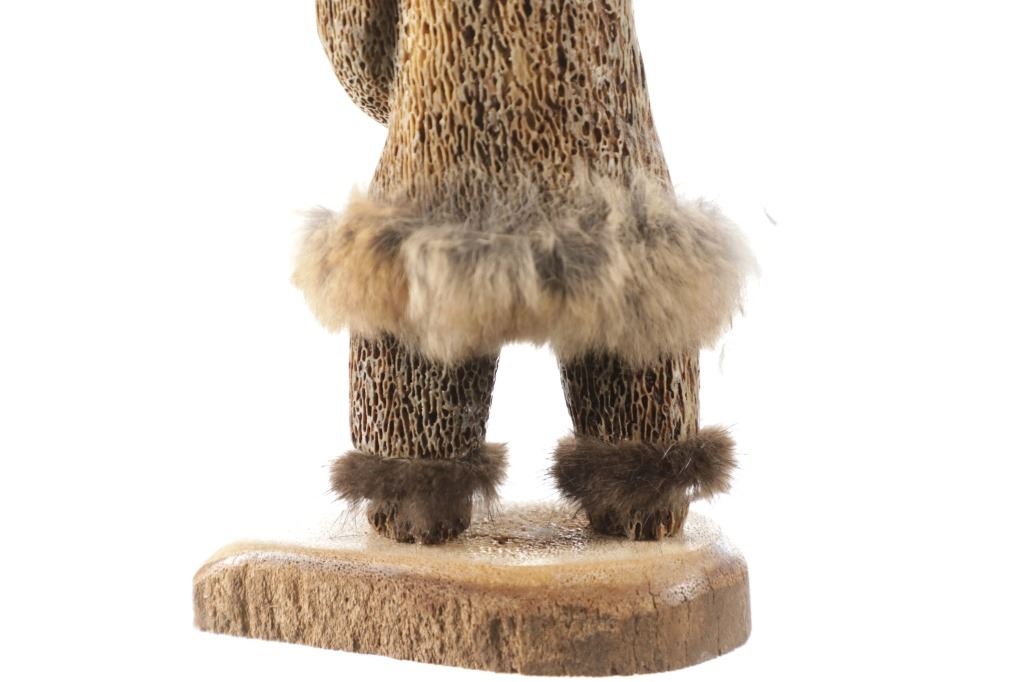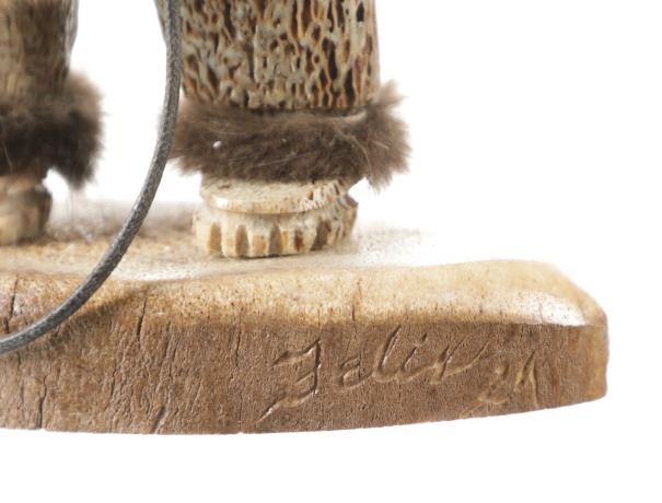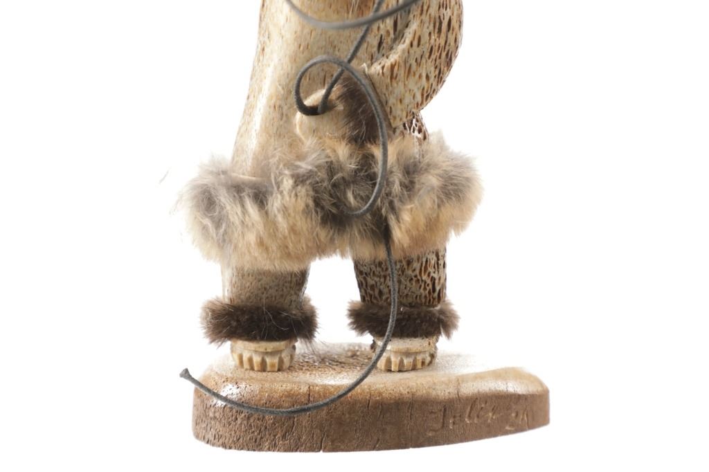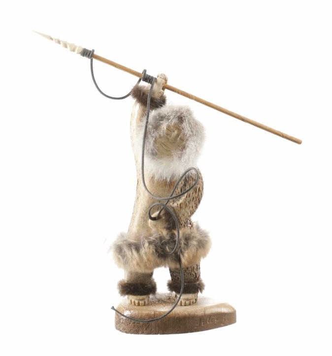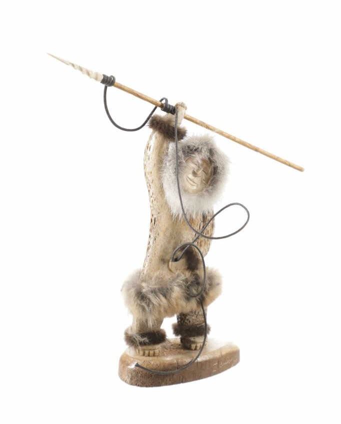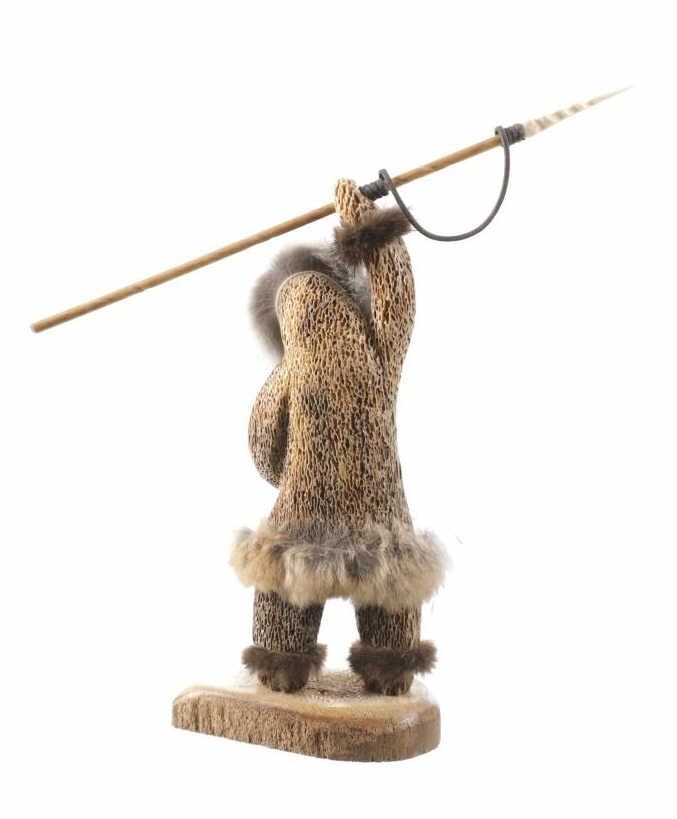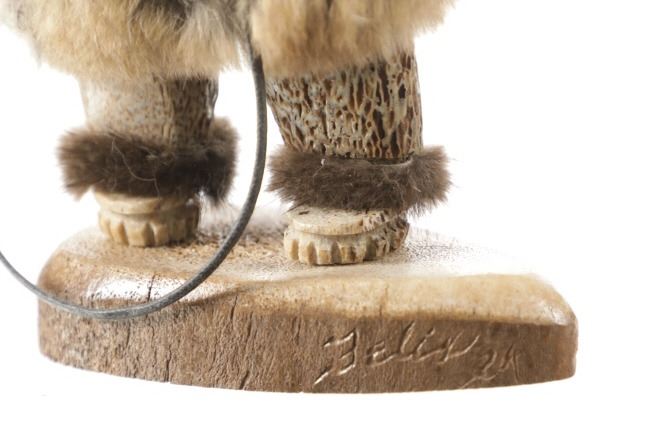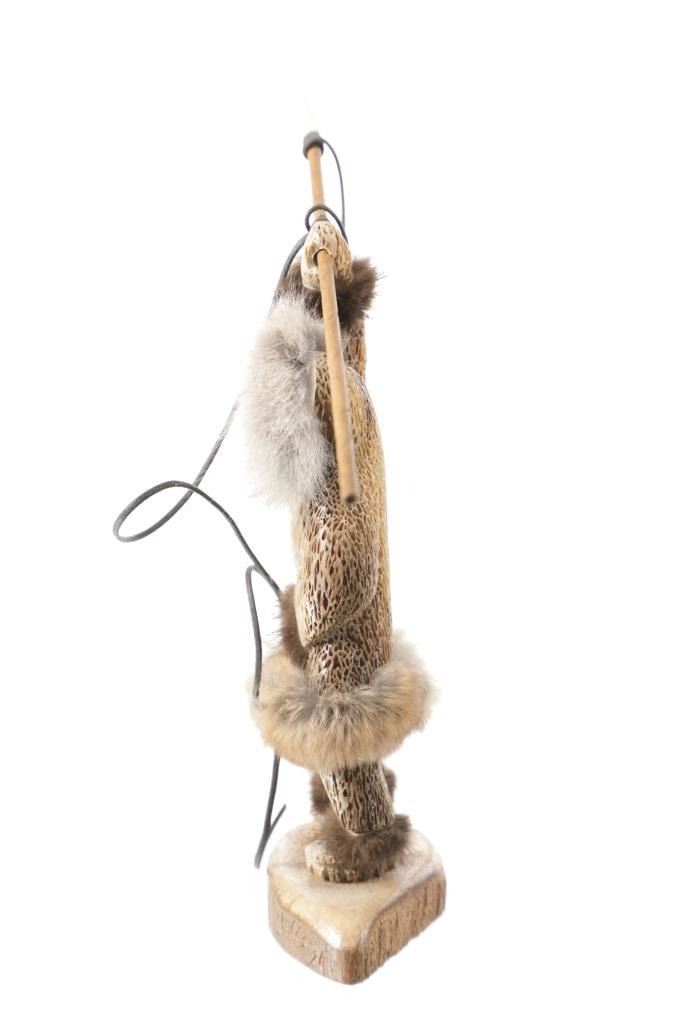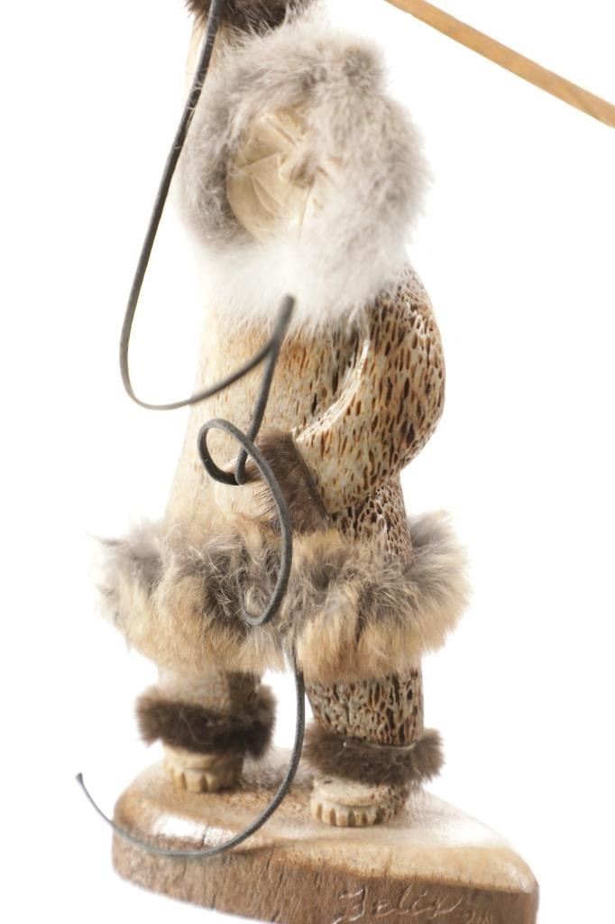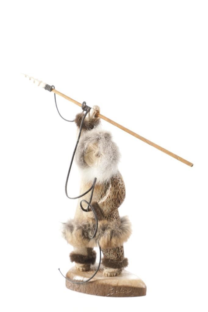 Featured in this lot is this hand-carved fisherman made from sperm whale bone by Inuvialuktun artist Ron Felix circa 1990s. Ron's Inuvialuktun name is Inung. He now resides in Yellowknife after being born and raised in Tuktoyaktuk. When Ron was in his twenties, about thirty years ago, he began carving. Prior to that, he was a jack of all trades who turned to carving in the 1980s when the oil and gas industry began to decline. Ron is making an effort to uphold the Inuvialuit carving tradition through his artwork. The piece shows an Inuit fisherman holding his fishing spear with one hand above his head. The spear is large and shows a sharp point with leather wrapped around the shaft. The spear can be removed from the mans hand and is still connected with the rest of the leather strap. The carving is constructed of sperm whale bone, animal fur and leather. The base of the sculpture shows the artist signature reading, "Felix 29". The piece shows good condition overall with little to near wear present and no signs of obvious damage noted. The piece measures 2 3/8" L x 10 1/4" W x 10 3/4" H and weighs 10 ounces.