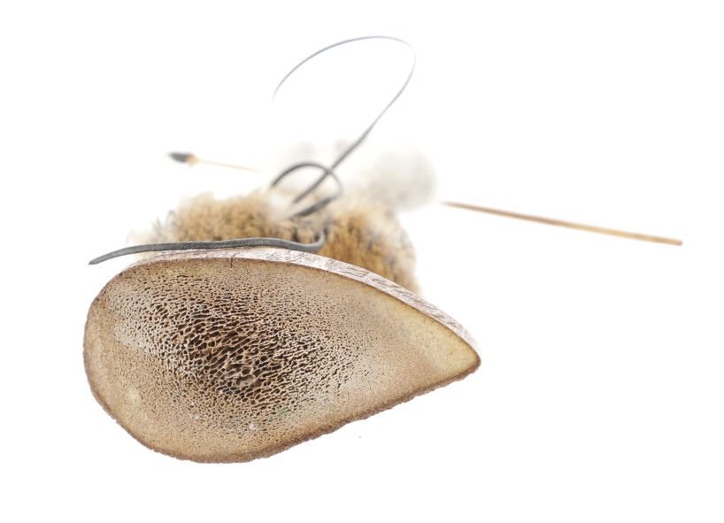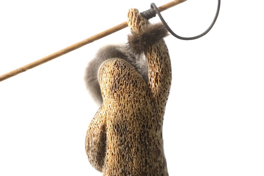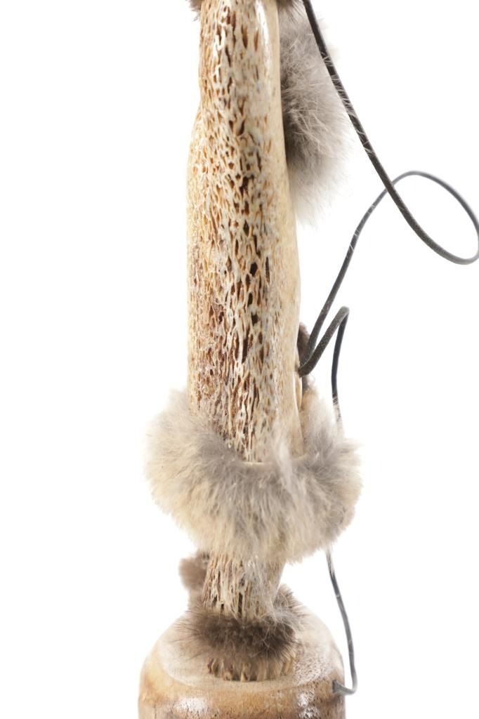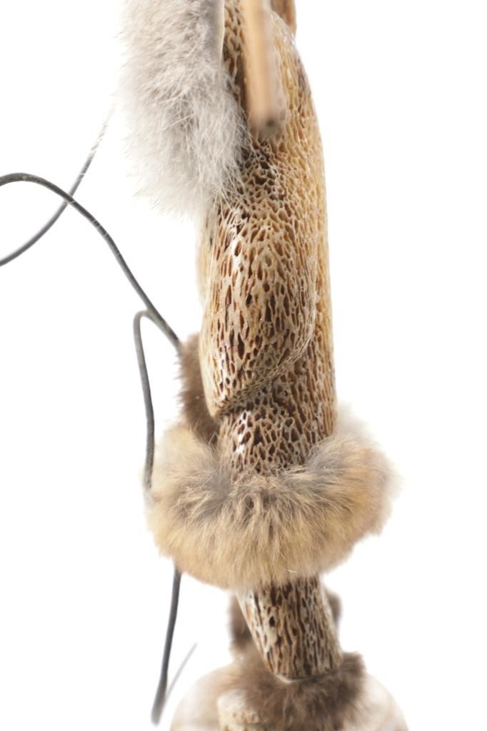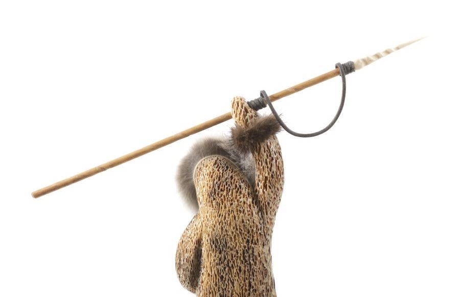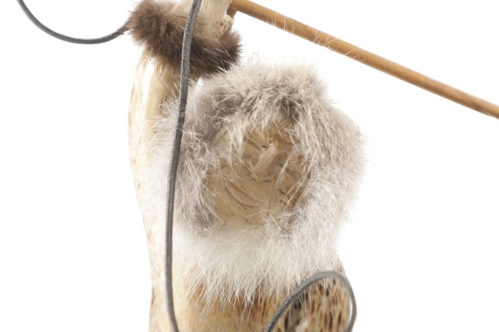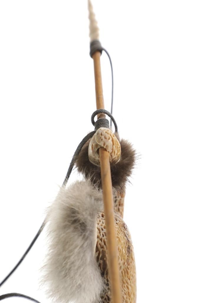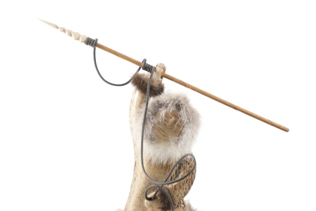 Featured in this lot is this hand-carved fisherman made from sperm whale bone by Inuvialuktun artist Ron Felix circa 1990s. Ron's Inuvialuktun name is Inung. He now resides in Yellowknife after being born and raised in Tuktoyaktuk. When Ron was in his twenties, about thirty years ago, he began carving. Prior to that, he was a jack of all trades who turned to carving in the 1980s when the oil and gas industry began to decline. Ron is making an effort to uphold the Inuvialuit carving tradition through his artwork. The piece shows an Inuit fisherman holding his fishing spear with one hand above his head. The spear is large and shows a sharp point with leather wrapped around the shaft. The spear can be removed from the mans hand and is still connected with the rest of the leather strap. The carving is constructed of sperm whale bone, animal fur and leather. The base of the sculpture shows the artist signature reading, "Felix 29". The piece shows good condition overall with little to near wear present and no signs of obvious damage noted. The piece measures 2 3/8" L x 10 1/4" W x 10 3/4" H and weighs 10 ounces.