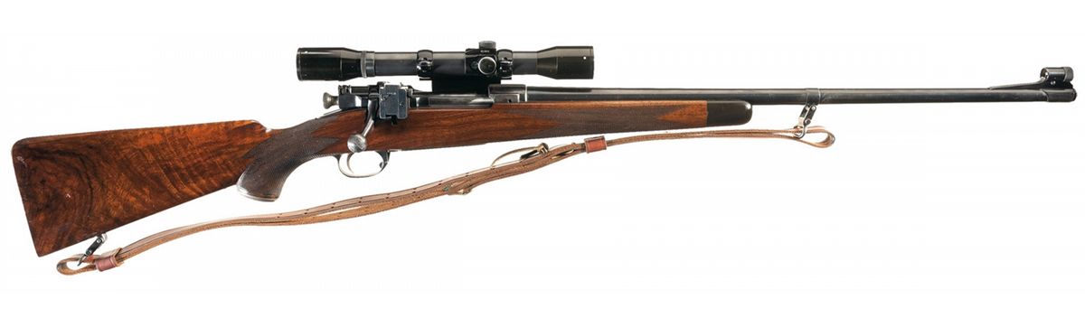 The top of the barrel is marked "R.G. OWEN - SAUQUOIT, NY No. 633". Hooded ramp front sight, receiver sight base only and Unertl 4x scope with Griffen & Howe mount. Checkered trigger, engraved bolt handle and grip cap with compartment and checkered buttplate with compartment. The nicely figured pistol grip stock features multi-point checkering, horn forend cap, quick release sling swivels and cheekpiece.