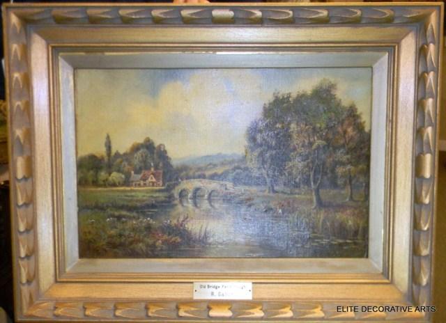 Robert Gallon (British 1845 - 1925) Oil Painting on board depicting the old bridge at Pearlborough. Scene includes people in a stream, bridge, boat, trees, flowers, a house and rolling hills. Signed lower right. Titled "Old Bridge Perlborough". Measures 13 3/4" h X 19 7/8" w + 2 1/4 matte and frame. Robert Gallon was a landscape and coastal painter who lived in St John’s Wood, London. He traveled extensively throughout the British Isles to paint his subjects, which included recognized views of England, Scotland and Wales. Gallon’s paintings can vary greatly in style, ranging from those with broad, loose and painterly rendered compositions strokes to others with more detail and precise “tight” brushwork. Gallon painted in a realistic style similar to that of Benjamin Will.