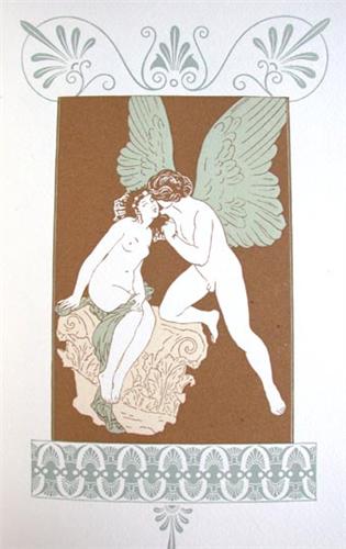 9 compositions aux douces couleurs : 5 hors-texte et 4 bandeaux. L'ouvrage se compose de 4 sections d'une vingtaine de poèmes chacune, chaque page étant ornée dans un style d'inspiration grecque : palmettes, filets ondulants ou grecqués, frises et culs-de-lampe divers.. tirés en diverses couleurs : brun, vert céladon, rosa saumon, vert olive, vert-de-gris.