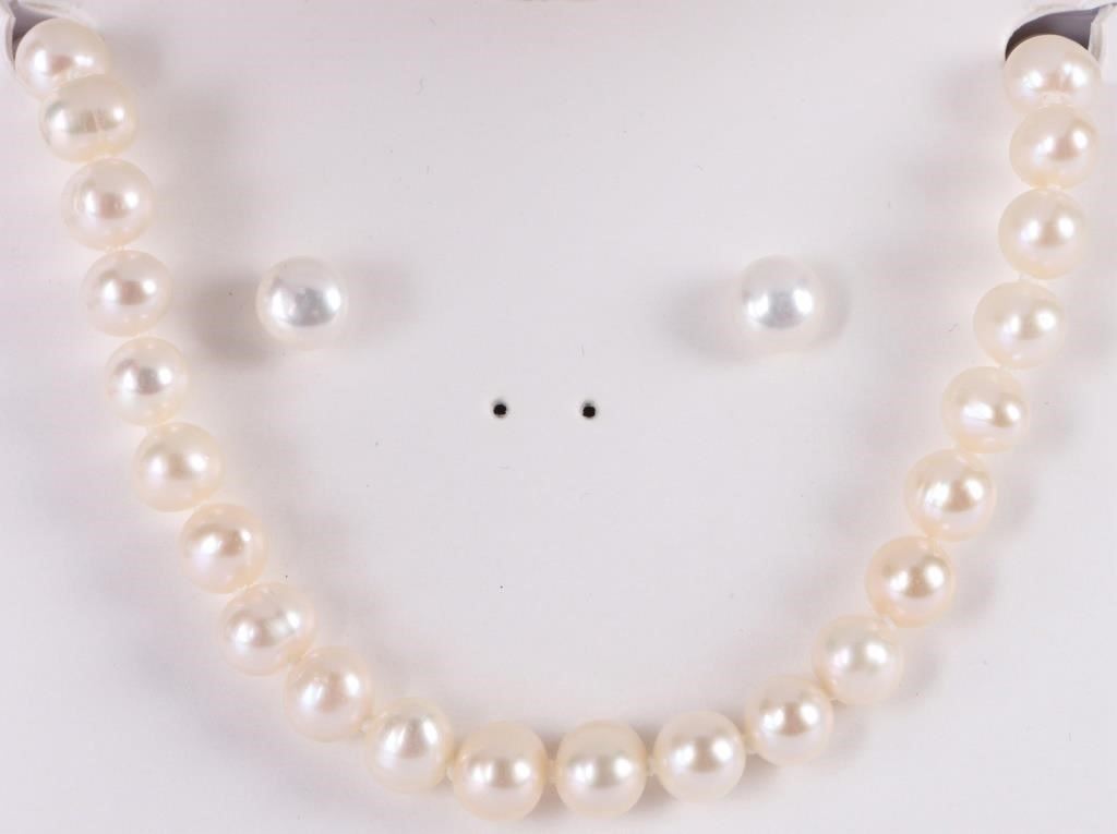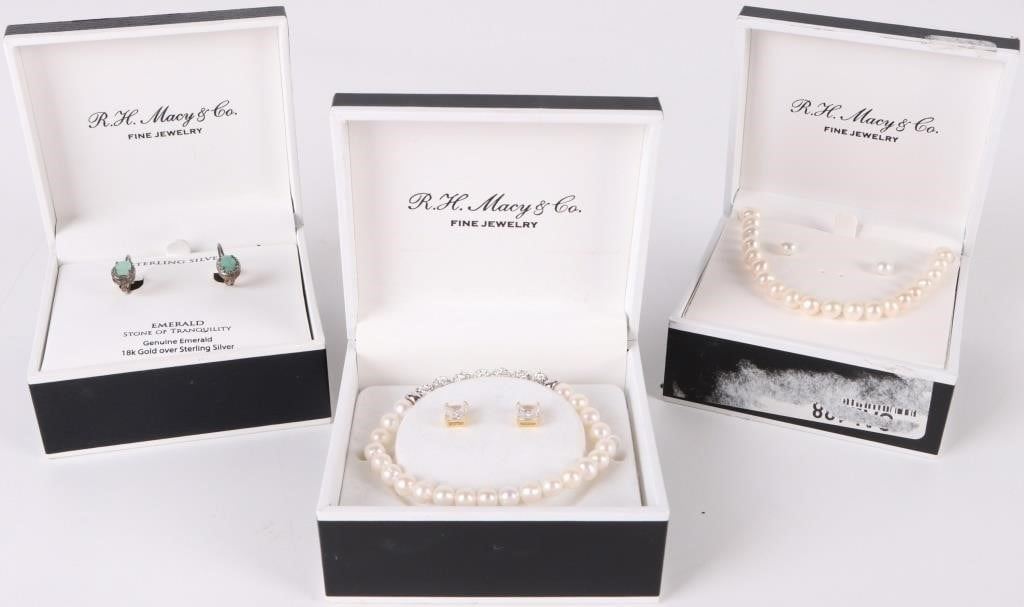 R. H. Macy & Co. sterling silver ladies jewelry to include one pearl necklace and earring set, one pearl bracelet and earrings set and one emerald and sterling silver earring set. Each set of jewelry comes with the original box.