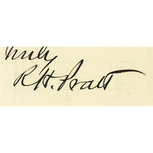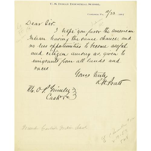 <B>Carlisle Indian School Founder Richard Henry Pratt Autograph Letter Signed</B></I> "<I>R. H. Pratt</B></I>". One page, 8" x 10", U.S. Indian Industrial School letterhead, Carlisle, Pennsylvania, October 23, 1901, to a Mr. O. P. Ginnley. Pratt, a Union general during the Civil War, was the founder of the influential Carlisle Indian Industrial School, a non-reservation school for Native Americans. He was convinced that for Indians to succeed as American citizens, they needed to renounce their tribal ways and enter into normal society. This school is legend in the world of football. Pratt's Carlisle Indians were regularly beating the finest teams in the nation during the early 20th century, producing many All-American players. Their coach, <B>"Pop" Warner,</B></I> and one of their star players, <B>Jim Thorpe,</B></I> are still revered today as representing the finest ideals of sportsmanship and competition. This letter has excellent content, reading in full: "<I>Dear Sir. I hope you favor the American Indian having the same chance, and no less opportunities to become useful and citizen among us, given to emigrants from all lands and races. Yours Truly...</B></I>" Originally purchased in 1957 from Charles Hamilton Autographs. Very fine condition with mailing folds and just a bit of light soiling that would easily clean, bold and clear writing. <I>From the Henry E. Luhrs Collection.</B></I>