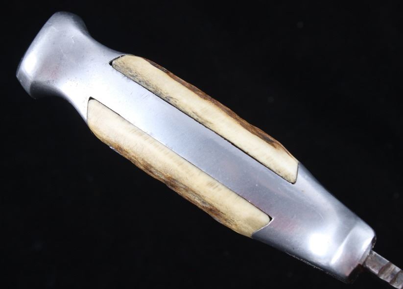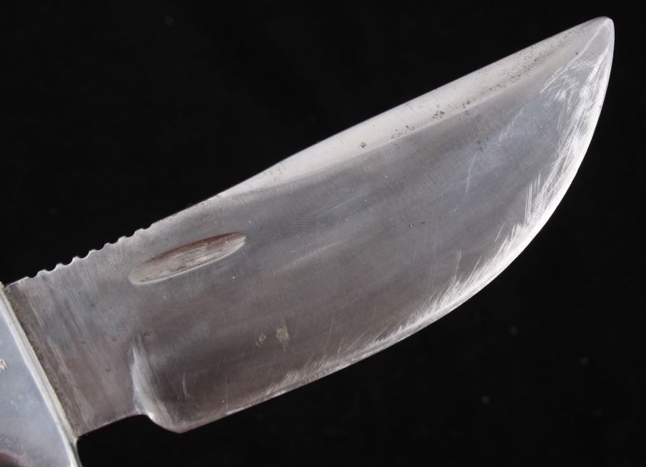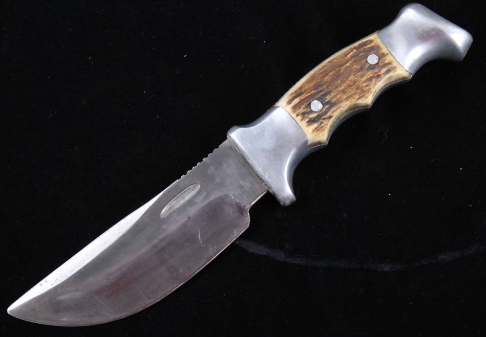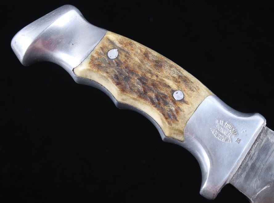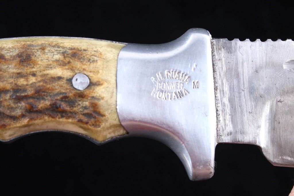 This is an R.H. Ruana skinner knife and leather scabbard, made in 1983. Rudy Ruana began making custom knives in the 1930's. His business has been family owned from the beginning and is still in operation today in Bonner, Montana. Ruana knives are highly regarded and sought after by knife collectors and enthusiasts. The knife features a broad sweeping hardened steel blade and an aluminum handle with inset antler grips. The handle is stamped "R.H. Ruana Bonner Montana", a hallmark that was only used in 1983. As told by his grandson, Rudy, he got tired of people asking what the "M" stamp meant, so it was no longer used from 1983 on. In 1984, the hallmark was changed to "Ruana Bonner Montana", thus dropping the "R.H." The knife comes with a custom leather sheath with an additional pouch on the front. The knife shows good condition overall and some light wear. The knife measures 9 3/4" long, with the blade being 5" long.