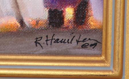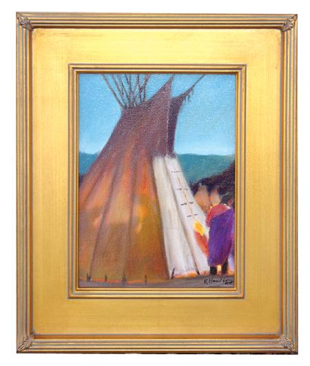 Signed original oil on canvas depicting a tipi with a campfire inside. Custom framed. Condition: excellent. 12" x 9" (18" x 15")