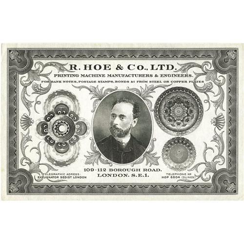 <B>R. Hoe & Co., LTD. Advertising Note.</B></I> This is a handsome black and white advertising note for a London company that manufactured printing machines. <B>Crisp Uncirculated.</B></I>