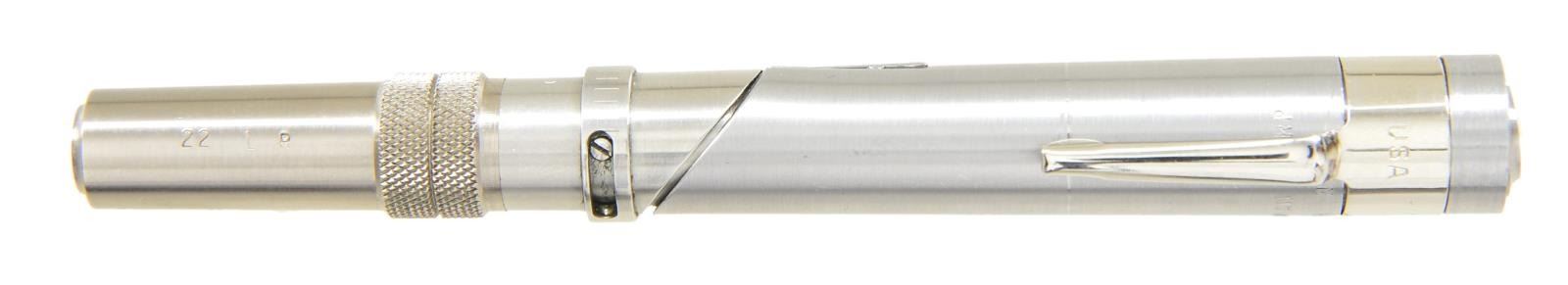 Cal. 22 LR. S# B002715.Bbl. 2". This is an extremely unique example of firearms ingenuity that hit the market in the 1990's. The vast majority of firearms that share similarities to the Braverman Pen Gun are classified by the BATF as an AOW (Any Other Weapon) & are highly regulated through the NFRTR. Firearms that fall under the perview of NFA (National Firearms Act) are commonly referred to as Class III & require extensive paperwork, background checks & Federal transfer fees. Pen guns are a prime example of an AOW, which is a firearm that doesn't resemble a traditional gun & includes examples such as cane guns, single shot flashlights & knife guns. The paperwork that must be submitted & approved for an AOW prior to transfer is exactly the same as used for purchasing machine guns, destructive devices & sound suppressors & can take upwards of a year before the buyer can take possession. The ingenuity of the Braverman design allows the purchaser of it to proceed exactly like any traditional firearm w/ no taxes or Federal registration necessary thus, they are extremely desirable. Because the Braverman must be positioned w/ the bbl. at an 80 degree angle from the body of it, it is no longer considered an AOW, but just a standard pistol. Full stainless steel construction w/ a knurled barrel ring. It incorporates a swiveling safety and pocket clip. UNATTACHED ACCESSORIES: original nylon carry case & owner's manual. CONDITION: as w/ the vast majority of these they typically see very little use spending their time as a display piece. Bright bore w/ strong rifling. Fire control mechanism appears to function correctly when cycled by hand. (22-2062/JZ). MODERN. $800-1,200.