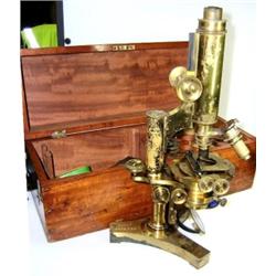 R & J Beck, London 15032, a lacquered brass monocular microscope with two revolving objectives, a lens to magnify the light source below the circular stage, various light filter and polarizer options below that, together with a mahogany box of spares, the microscope, 33cm high £200-300