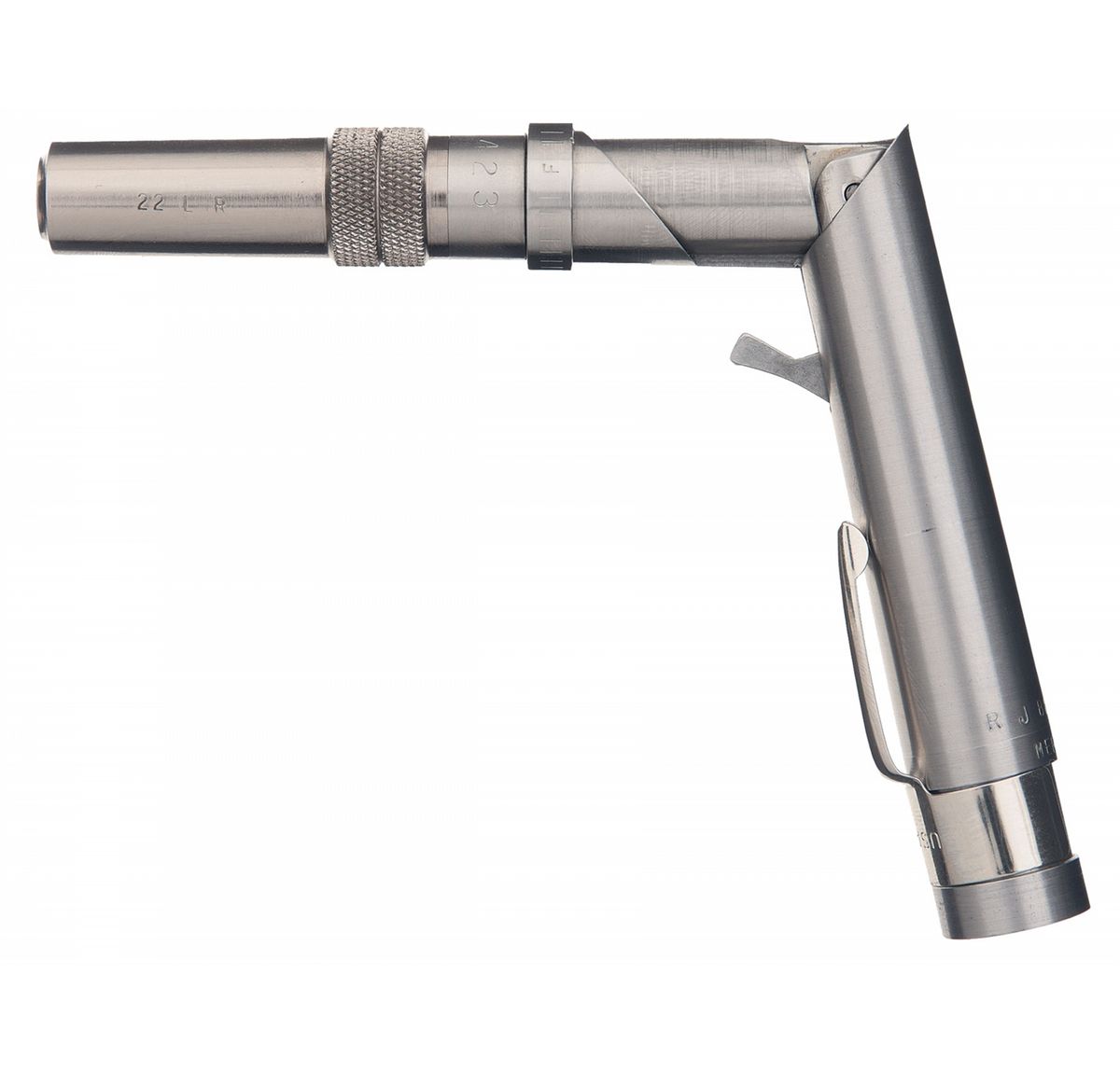 Manufactured between 1995 and 1997, these rare pistols resemble a pen and were designed as a last resort defense pistol. The forward portion including the barrel must be pulled and bent into the "L" shaped firing position. Full stainless steel construction with a knurled barrel ring, swiveling safety and pocket clip.