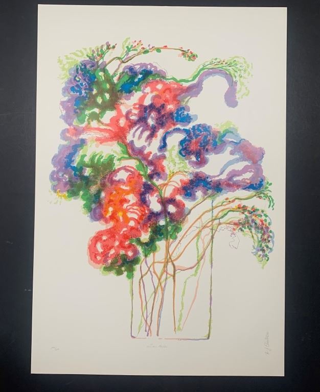 R.J. Christensen's "Winter Bells" limited edition print, signed lower right and numbered 176/250 lower left. A lovely piece of more of an abstract depiction of colourful flowers in a vase. This piece is in great condition.