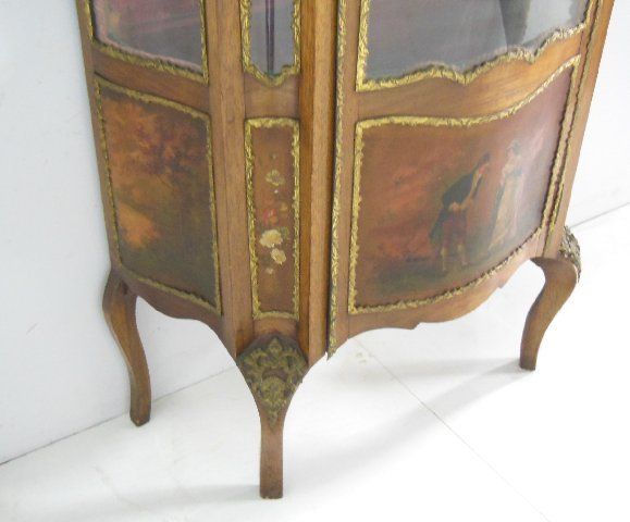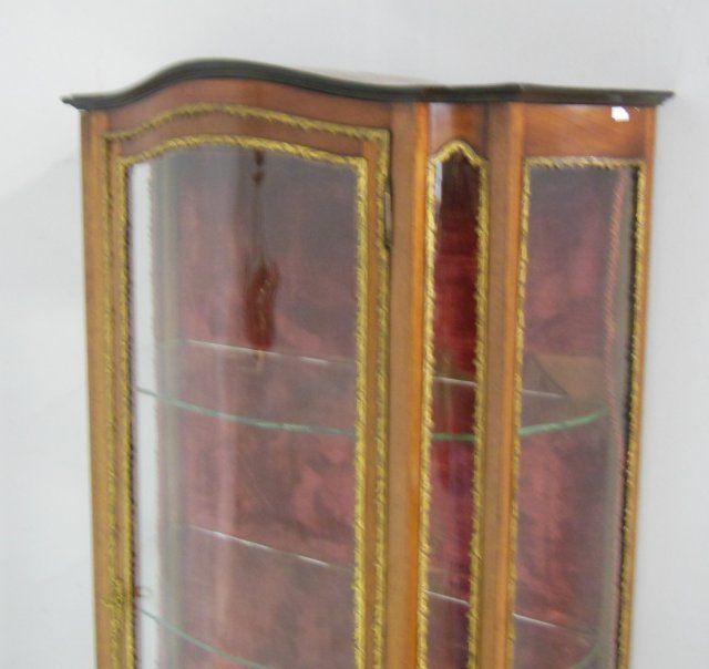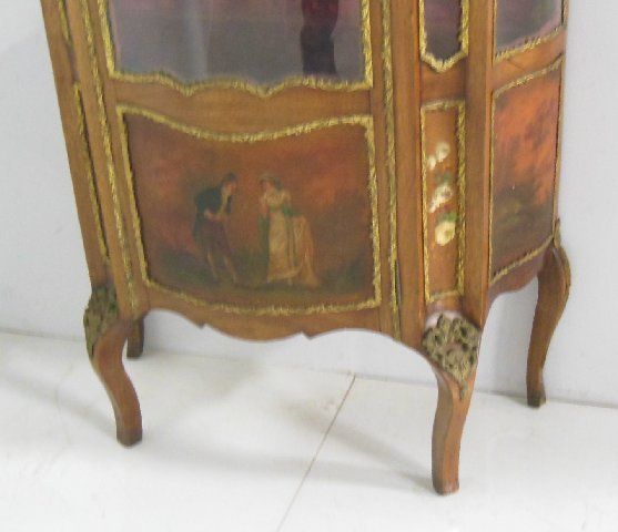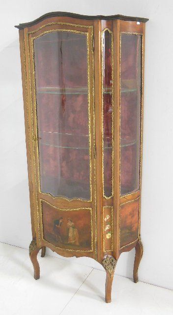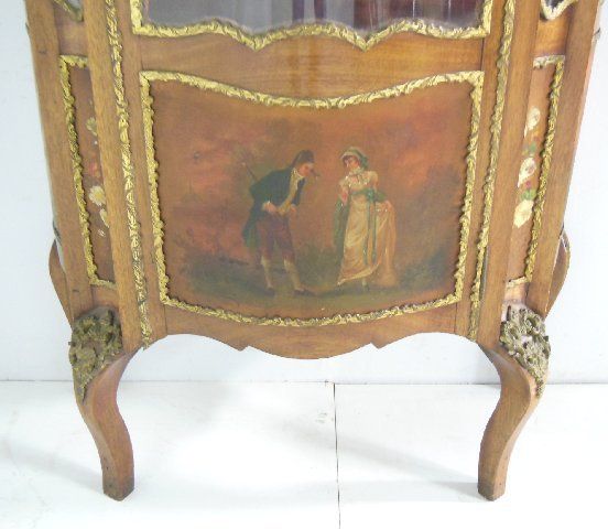 Serpentine glass, with "Courting Scenes", glass shelves, velvet back. Approx. 29 5/8" x 65 1/2" x 14".
