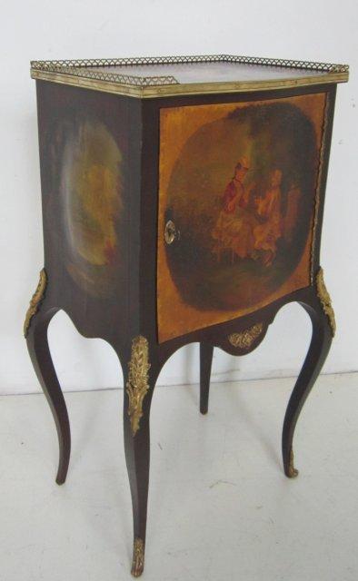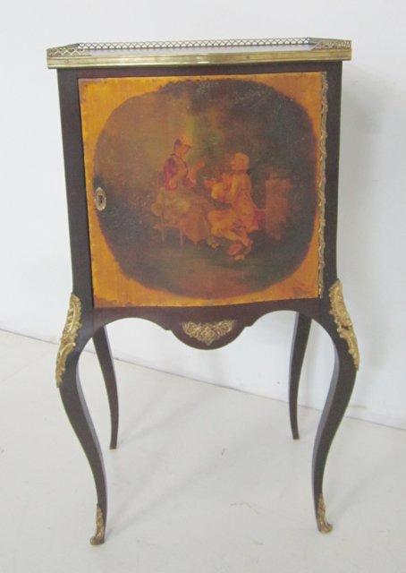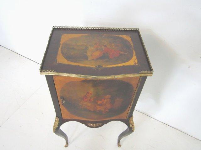 With paper label underneath, handpainted scenes on mahogany, ca. 1890-1910. Approx. 38" H x 15" D. Please read our terms of sale.