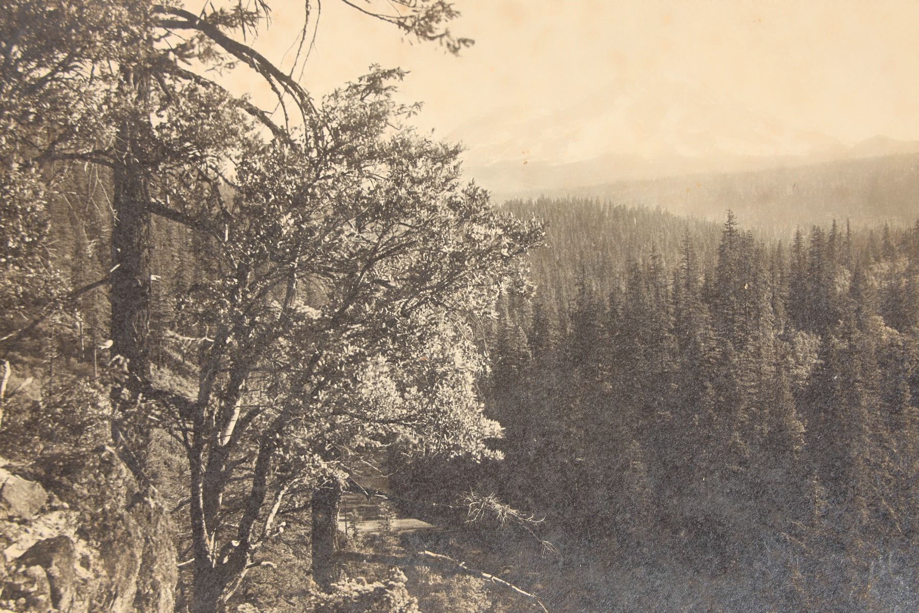 Lot of (2) very early northern California B&W Photos by R.J. Waters of San Francisco. Waters was famous for his early California photography, from about 1891 to 1937. Both photos appear to be taken from Highways (440, 449) and are panoramic in scope. The larger view is of Mt. Shasta from upper Soda Springs, the other is of Shasta Springs and its railroad tracks. Photos are approx. 4.5"x7" mounted on card stock. One reverse is the photographer's studio on Sutter St. in San Francisco. One displays corner damage, otherwise both are in fair to good condition.