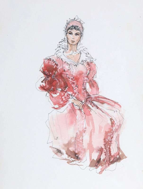 R. Jeronimo, Woman in Pink Dress, Watercolor and Ink Drawing