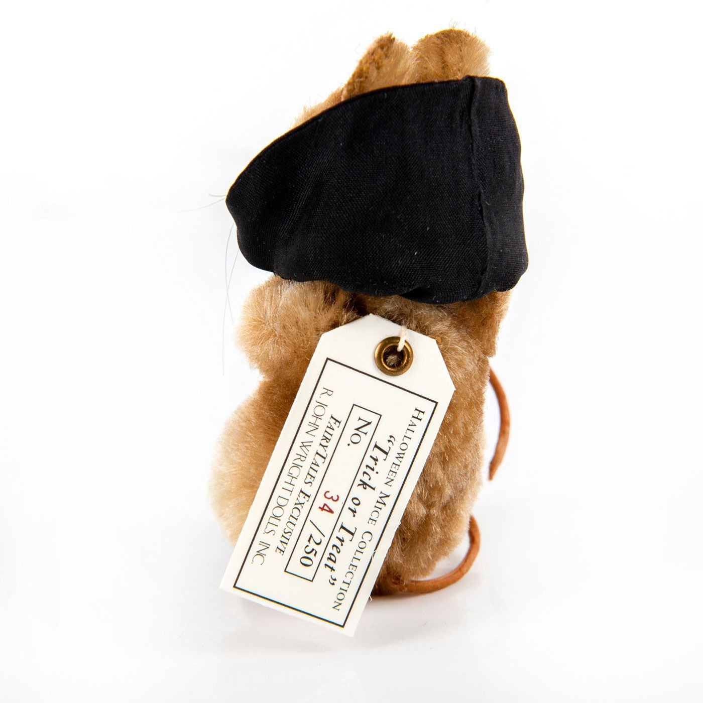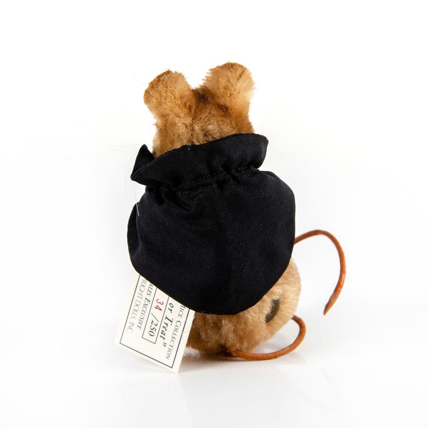 Halloween Mice Collection. Limited edition 34 of 250. FairyTales Inc. Exclusive. Made from the finest mohair and has jointed shoulders and neck, glass eyes, inset whiskers, resin hands and feet, leather tail, silk cape and hat. Hand painted all-felt candy corn. Includes Certificate of Authenticity and box.